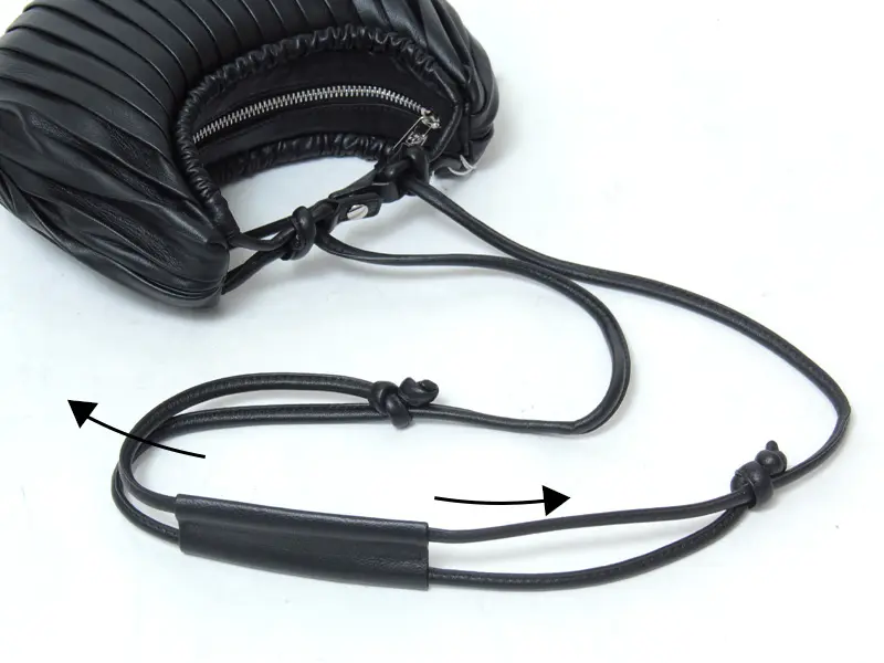 ショルダーは簡単に長さ調節が可能です。ストラップを左右に引っ張ると長くなり、結び目を左右に引っ張ると短くなります。ハンドから肩掛け・斜め掛けに自由にスタイルチェンジできます。スナップボタンを留めることハンドバッグとしてお使いいただけます。