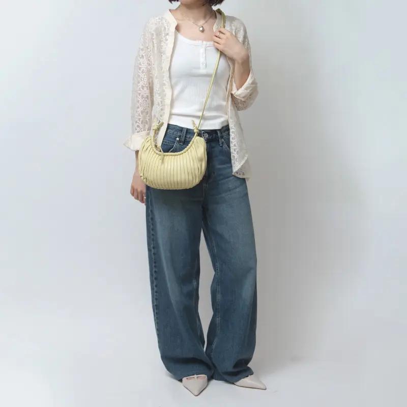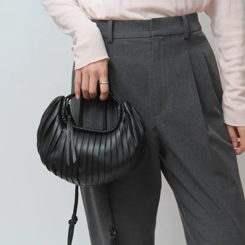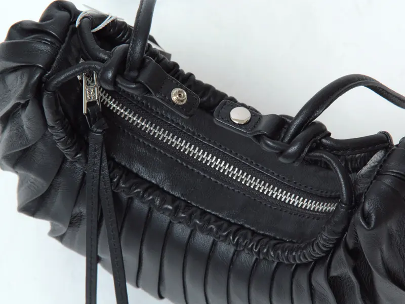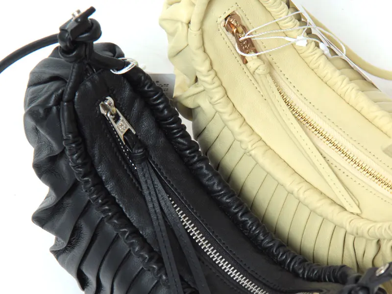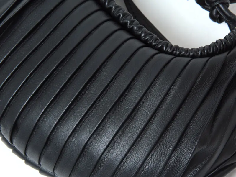 柔らかく軽量な羊革を使用。プリーツ加工の立体感とシャーリングのコンビネーションが、バッグに奥行きと上品さをプラスします。きめ細かくしなやかな革は手に馴染みやすく、ほんのり光沢感があり、スタイルに品の良さを添えてくれます。