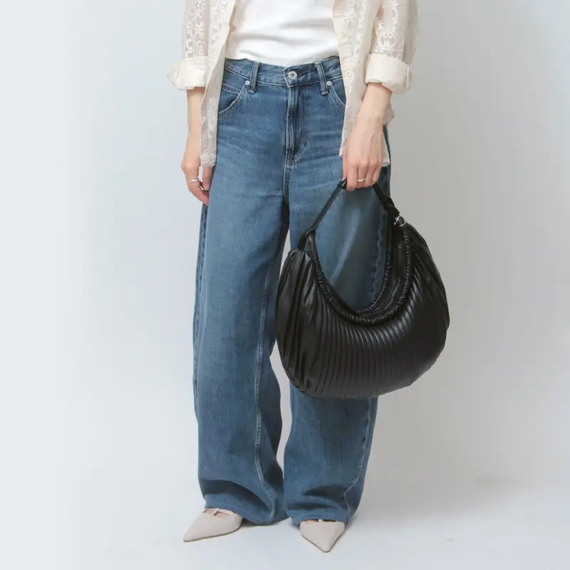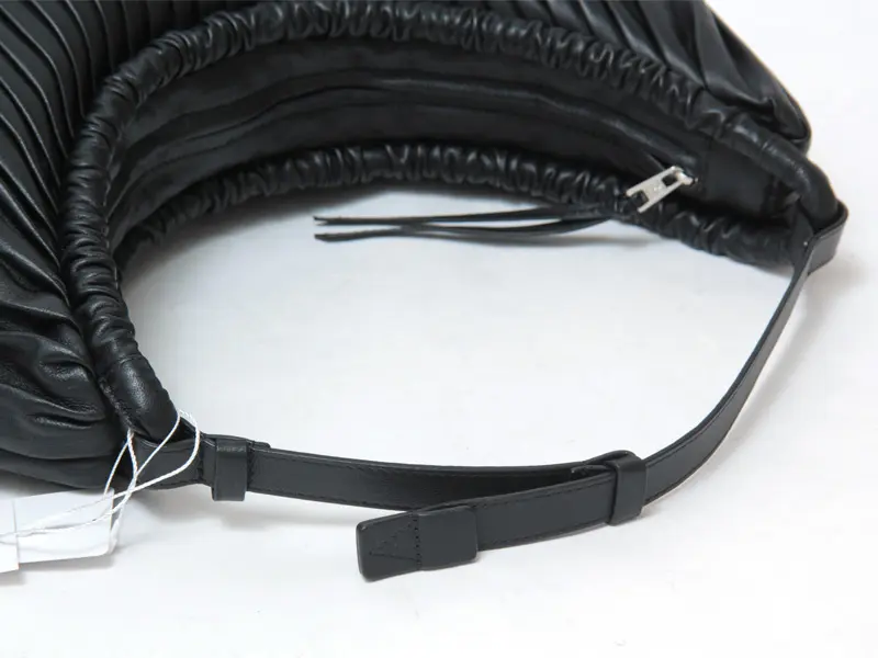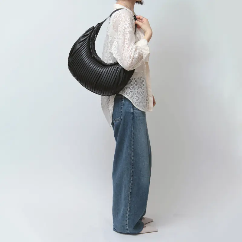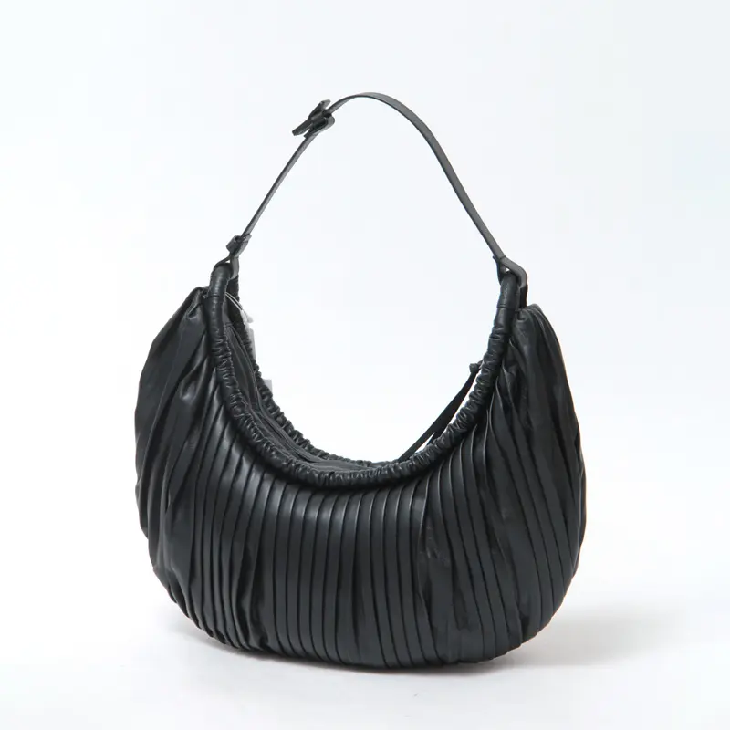柔らかく軽量な羊革を使用。プリーツ加工の立体感とシャーリングのコンビネーションが、バッグに奥行きと上品さをプラスします。きめ細かくしなやかな革は手に馴染みやすく、ほんのり光沢感があり、スタイルに品の良さを添えてくれます。