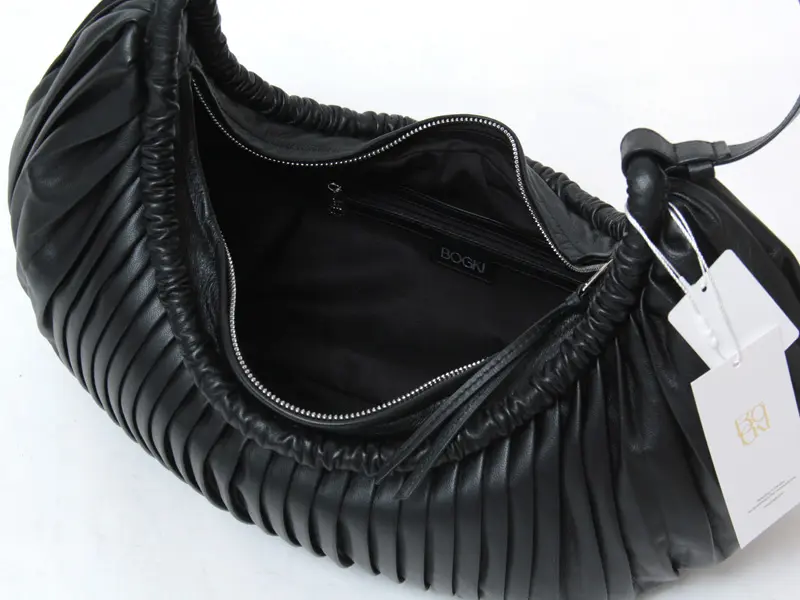 韓国・ソウル発のブランド「BOGKI(ボクギ)」RIPPLEシリーズのショルダーバッグ。柔らかく軽い羊革を使用し、表面に施されたプリーツ加工が使うほどに自然で上品な表情に変化します。本体の機械的なプリーツと上部の不規則なシャーリングの組み合わせが、RIPPLEバッグの大きな特徴です。必需品+αの荷物がしっかり収納できる余裕のあるサイズ感で、日常からお仕事まで活躍します。