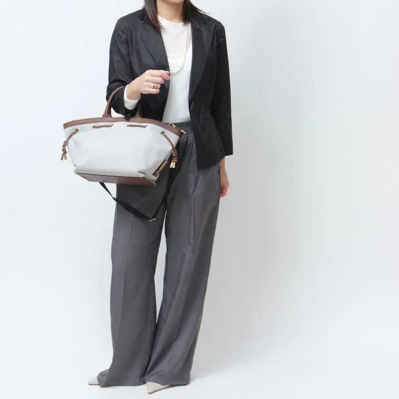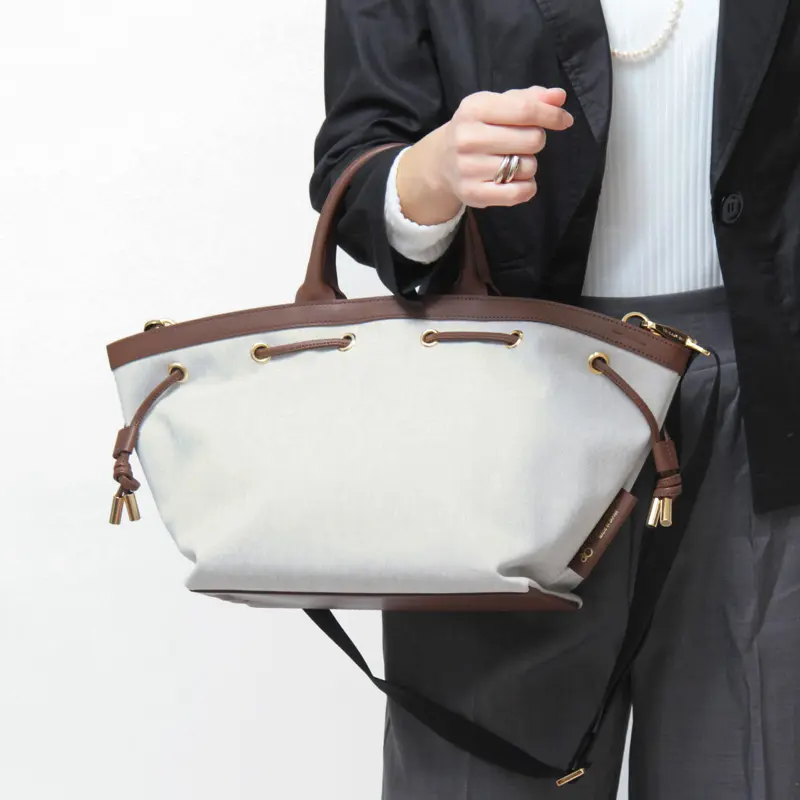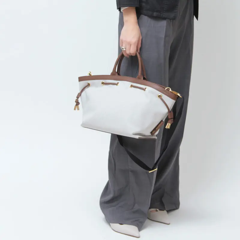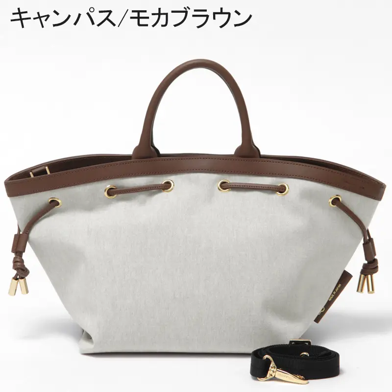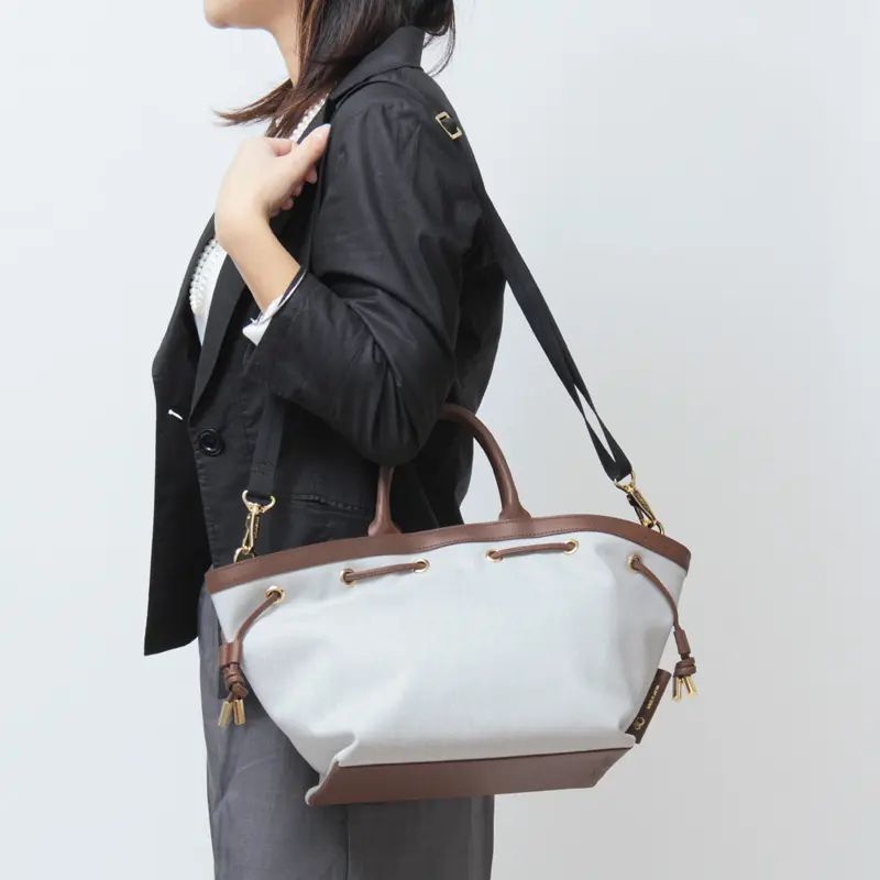 口元に丸みを持たせた舟型フォルムに、巾着デザインをプラスし、細く繊細なマルテハンドルと、随所に施された発色の美しいイタリアンレザーやドロストコードが、シンプルな中に女性らしいアクセントを添えています。取り外し、調節可能なショルダーストラップ付き。肩掛けや斜め掛け、手持ちなどスタイル自在で、クロスボディにすれば両手が空き、ショッピングや旅行、自転車通勤など、アクティブなシーンでも快適に活躍します。