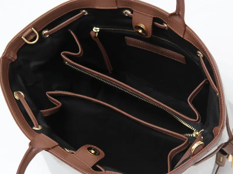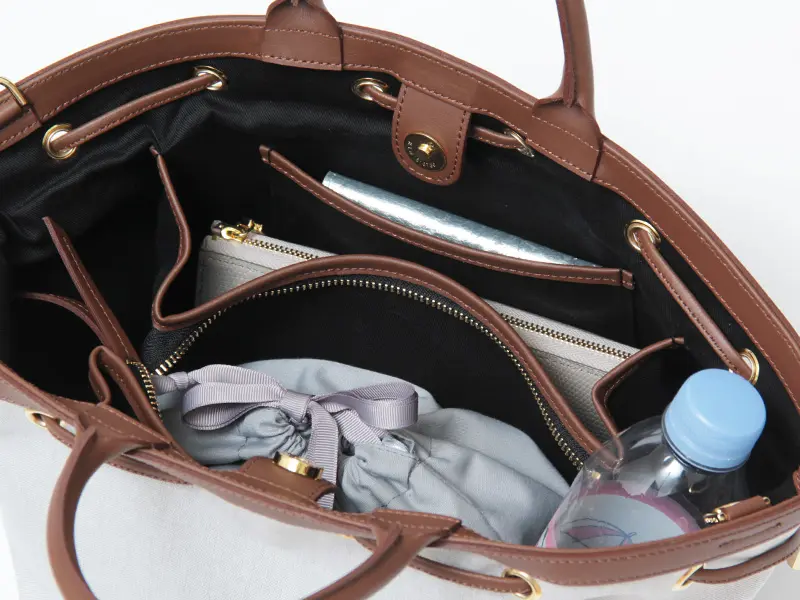 バッグ内部は3部屋に分かれた構造。頻繁に出し入れするお財布などのアイテムはアオリポケットへ、メイン収納にはしっかりマチがあるので、お弁当も収まります。ポケットも充実しており、荷物の整理がしやすく、中身が迷子になりにくいのも嬉しいポイント。