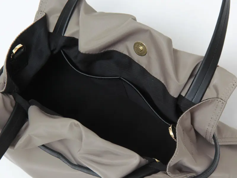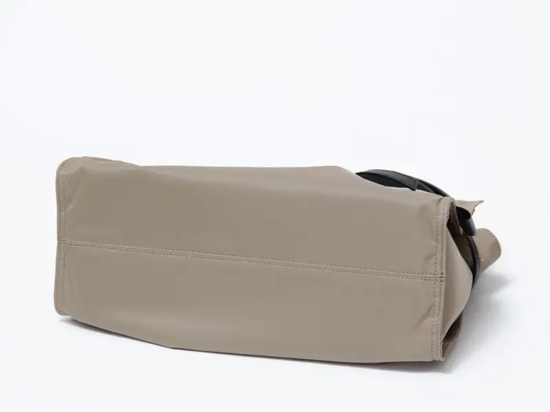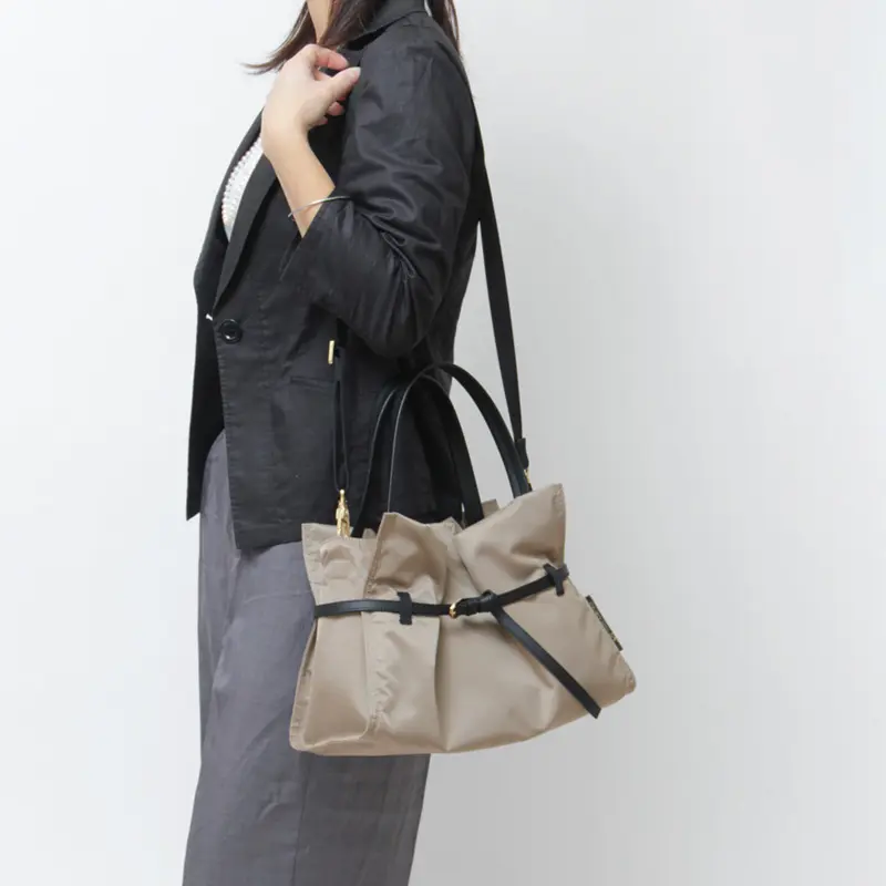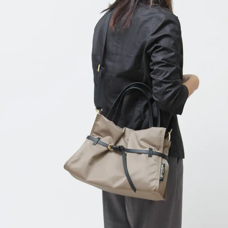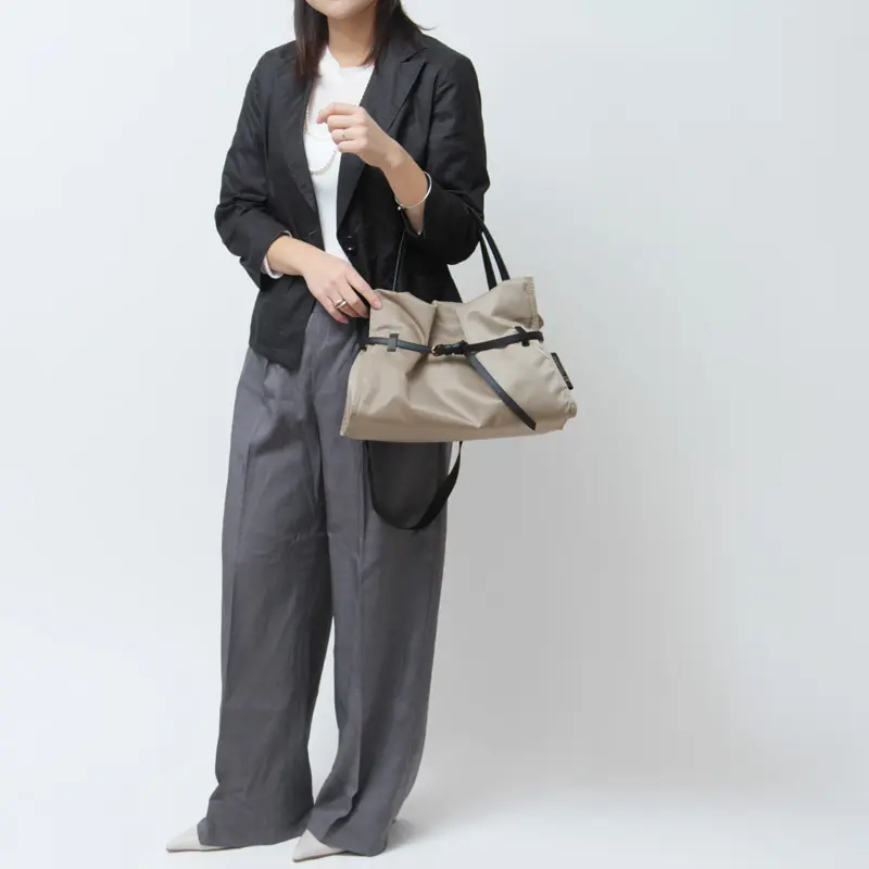 機織りからコーティングまで国内生産された、こだわりのナイロン素材を使用。光沢を抑えたマットな表情と、斜めに織り上げたツイル生地ならではの柔らかさが特徴です。ラフになりすぎず、上品に持てる質感に仕上げています。弱撥水性があり、お手入れしやすく軽量なのも、毎日使いたくなる理由のひとつです。