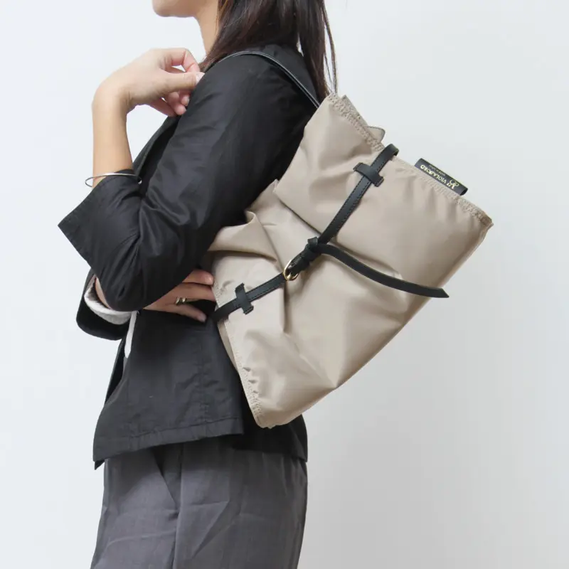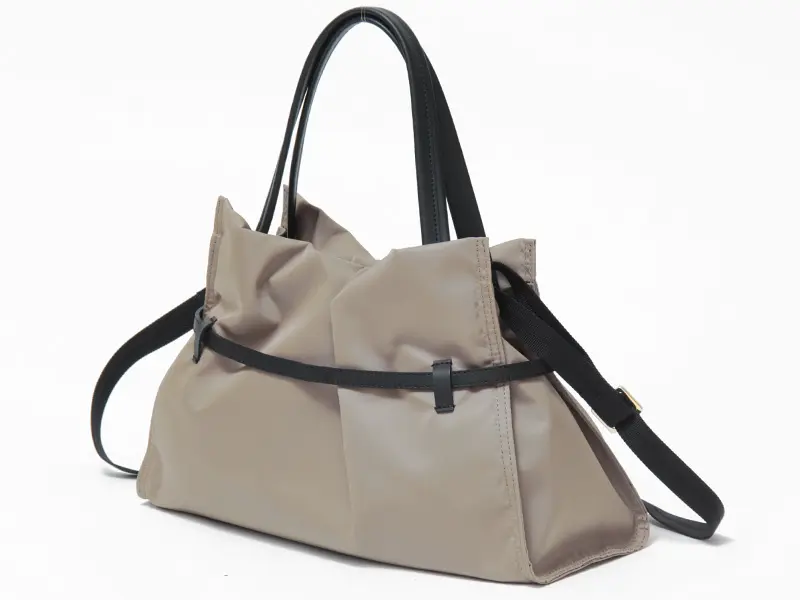 カジュアルなナイロン素材に、レザーのベルト使いを効かせた、大人女性が品よく持てるVIOLAd’ORO(ヴィオラドーロ)のトートバッグ。光沢を抑えたマットなナイロンを使用し、ふわりと体に馴染む柔らかな質感と、ゆとりのあるシルエットは、きれいめでありながら気負わず持てる仕上がり。レザーベルトを効かせることで、カジュアルになりすぎず品よく持てます。軽量で扱いやすく、きれいめスタイルからデイリーまで幅広いシーンで活躍する日本製の2wayトートです。