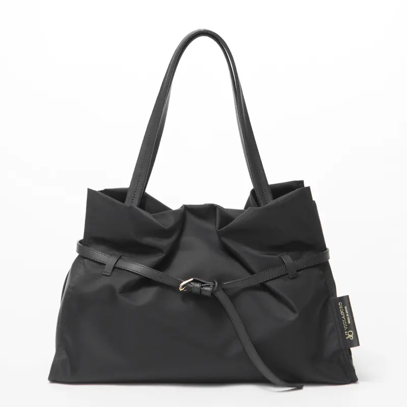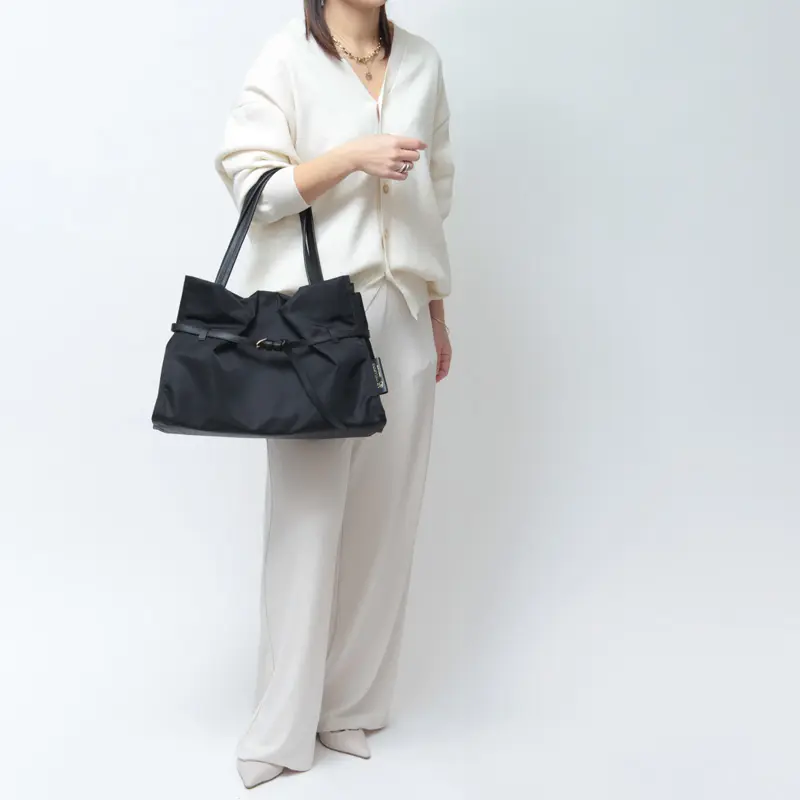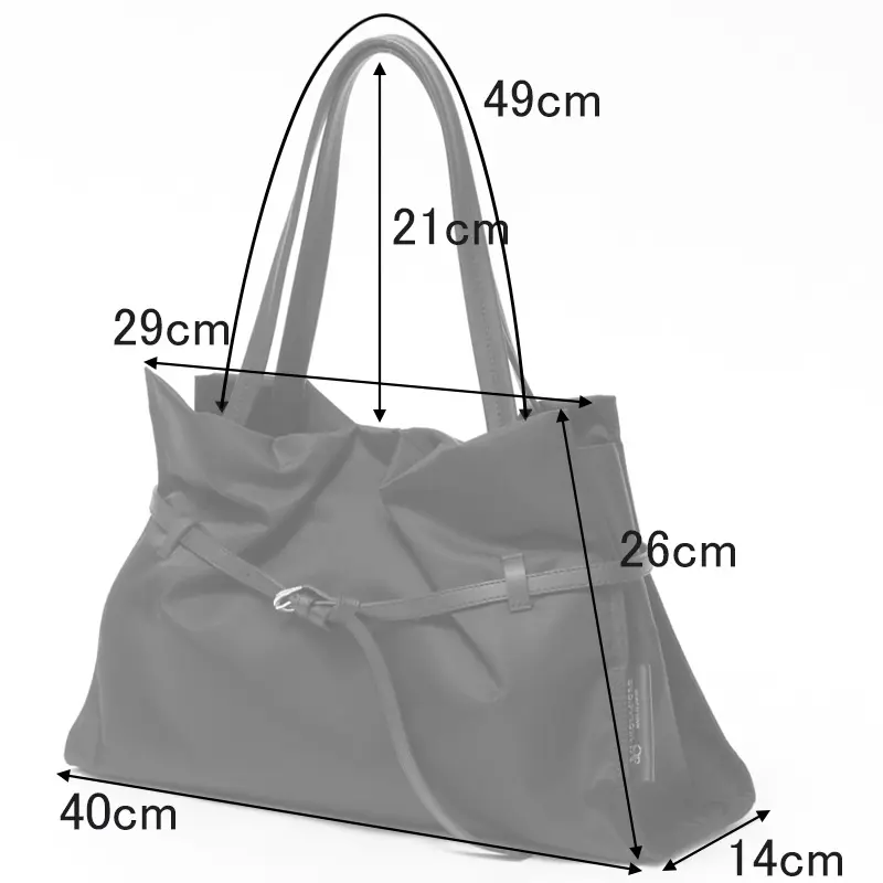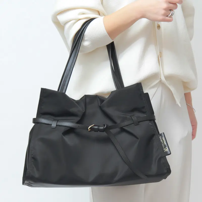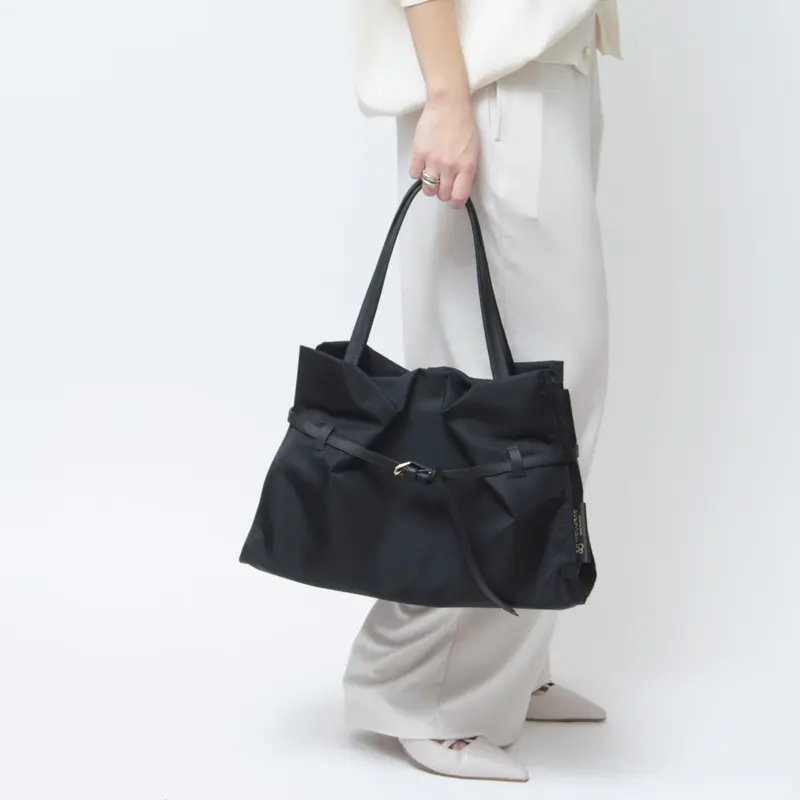 ふんわりとしたシルエットがコーディネートに程よい抜け感をプラス。開閉部分にはゴムを施し、あえてステッチを入れないことで、くしゅっとした自然なギャザーが生まれ、女性らしい柔らかな表情に。ボディに巻いた細身のレザーベルトが全体をさりげなく引き締め、カジュアルになりすぎず、きちんと感もキープします。肩掛けしやすい長めのハンドル設計で、通勤からお出かけ、旅行まで、シーンを選ばず活躍するデザインです。