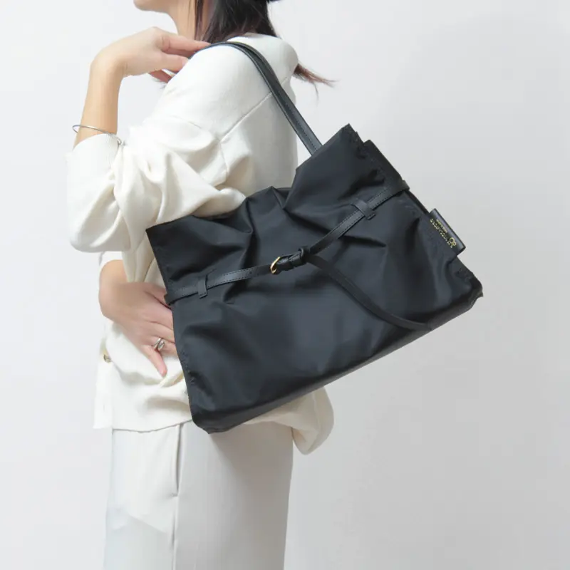機織りからコーティングまで国内生産された、こだわりのナイロン素材を使用。光沢を抑えたマットな表情と、斜めに織り上げたツイル生地ならではの柔らかさが特徴です。ラフになりすぎず、上品に持てる質感に仕上げています。弱撥水性があり、お手入れしやすく軽量なのも、毎日使いたくなる理由のひとつです。