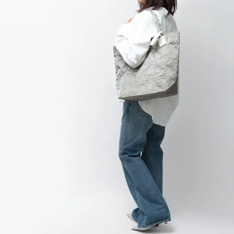 ナイロン生地の内側にアルミを重ねたアルミ・ボンディング素材を使用。自然に生まれるシワ感が特徴で、シンプルな装いにもほどよいアクセントを添えてくれます。控えめな光沢があり、きれいめなスタイルやお仕事シーンにも違和感なく馴染みます。