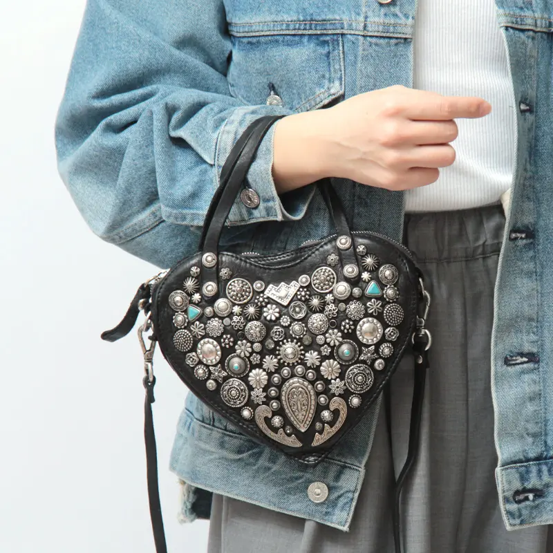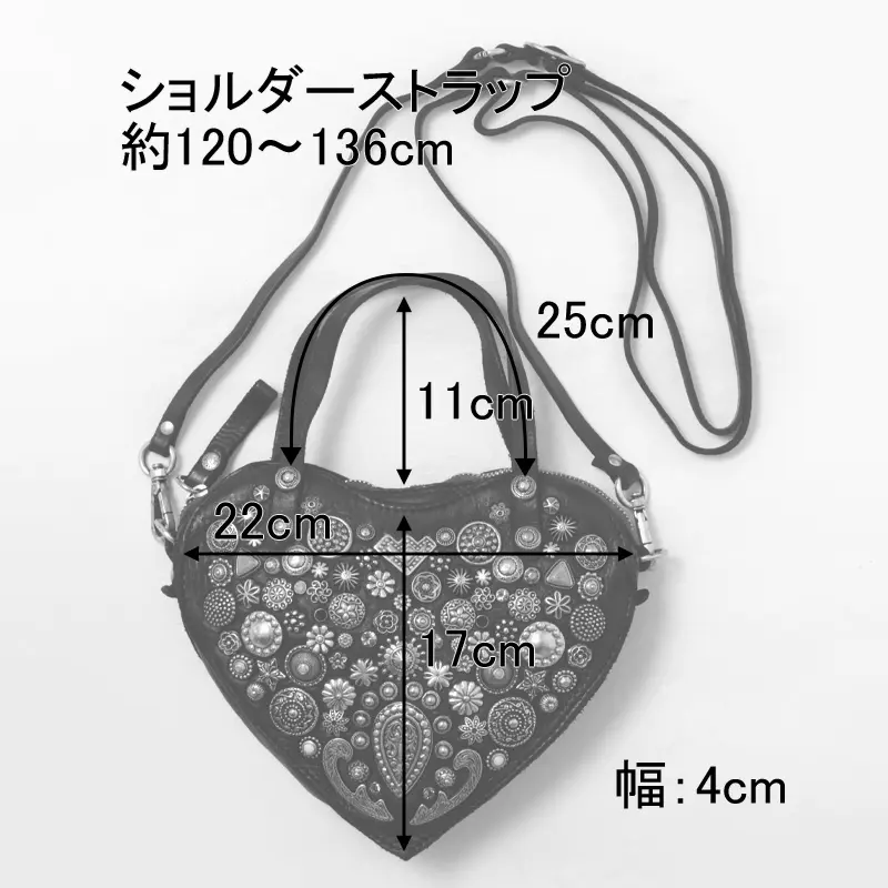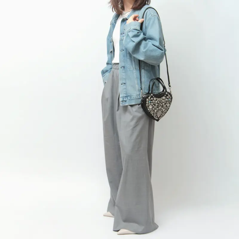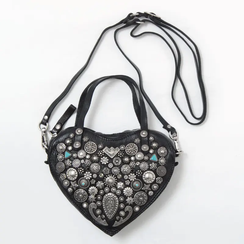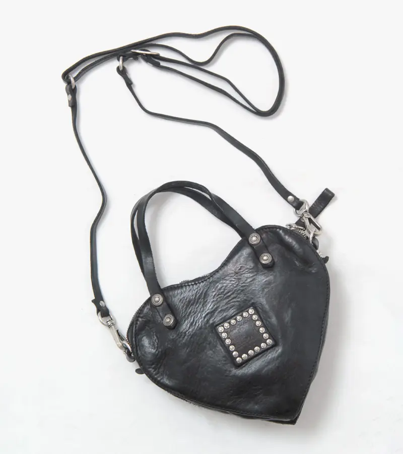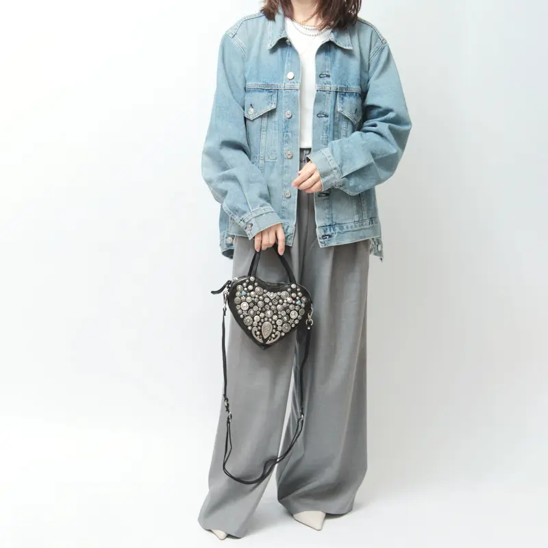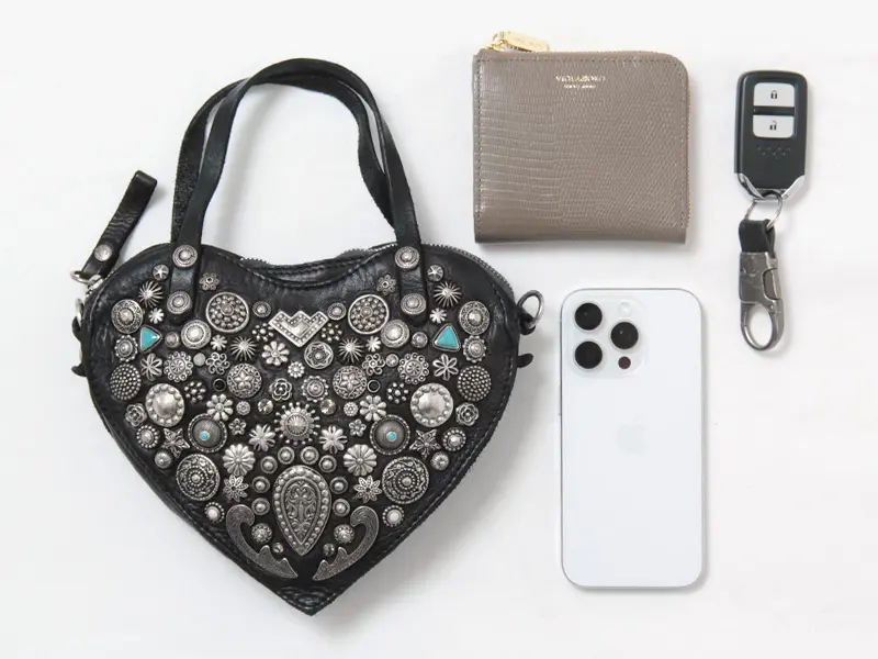ハートモチーフの甘さも、ミニサイズだからこそ大人のバランスに。スタッズのエッジが加わることで、可愛さだけに寄らない表情に仕上がっています。手持ちでも斜めがけでも使える2WAY仕様で、スタイリングに合わせた持ち方が可能。コンパクトながら存在感のあるデザインは、コーディネートのアクセントとして自然に映えるひと品です。