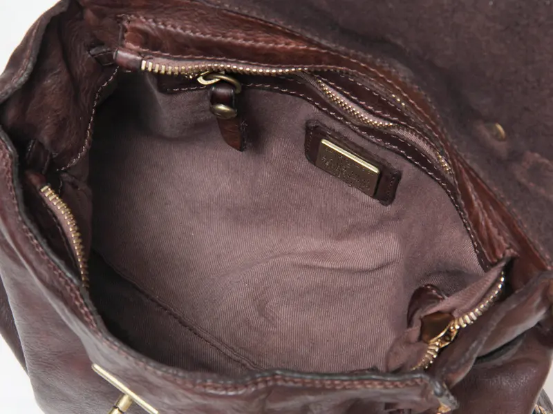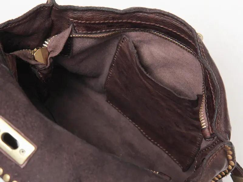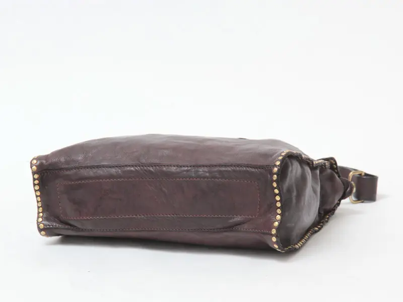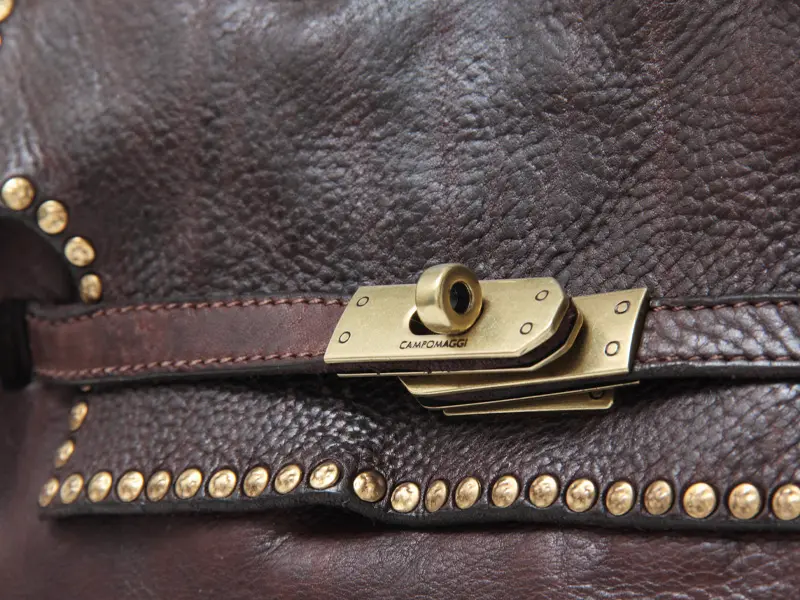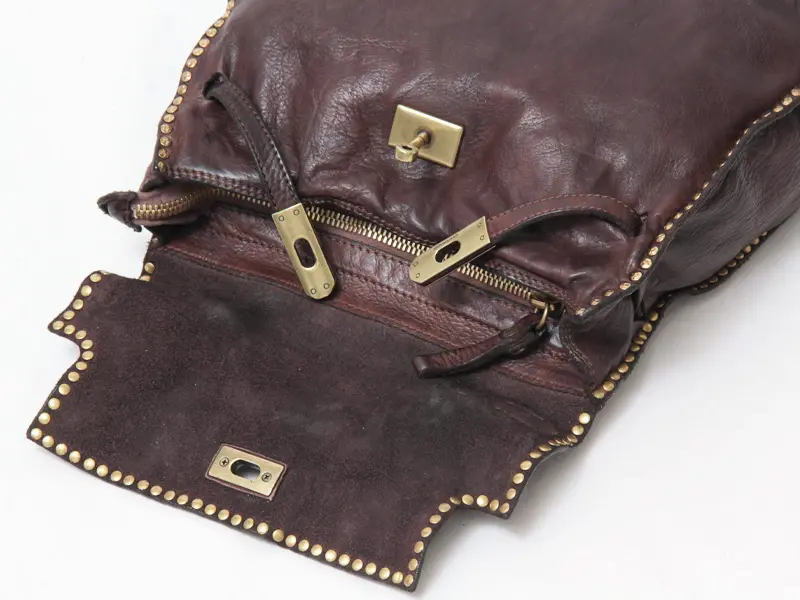バッグを縁取るスタッズデザイン。レザーの表情と重なり合うことで、質感のコントラストが生まれ、カンポマッジならではのクラフト感と奥行きを演出します。本体には植物タンニンなめしの牛革を使用。染色と洗い加工によって現れる色ムラやシワは、革本来の個性。使い込むほどに柔らかく馴染み、時間とともに深まる表情を楽しめる、Campomaggiならではのレザーです。
