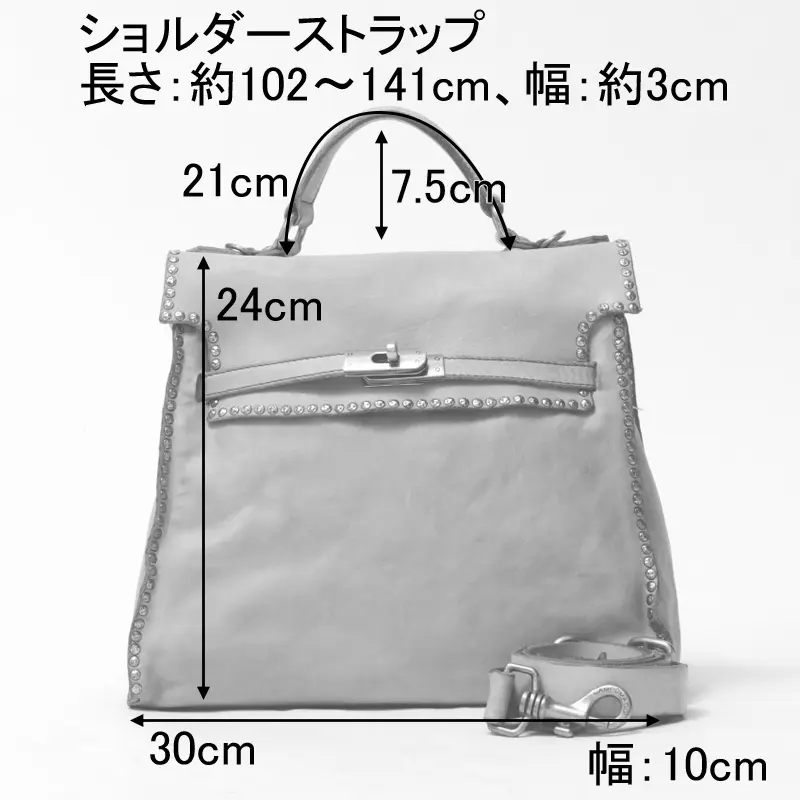 端正なフォルムが装いを引き締めながら、レザーやスタッズの表情がほどよい抜け感を演出。ハンドルを持って手持ちするのはもちろん、ショルダーストラップを付ければ斜めがけも可能な2WAY仕様。幅約3cmの太めのストラップは、肩にかかる負担を和らげ、安定感のある持ち心地を叶えます。実用性だけでなく、スタイリングのバランスまで計算された設計。日常使いに心地よく寄り添うディテールです。