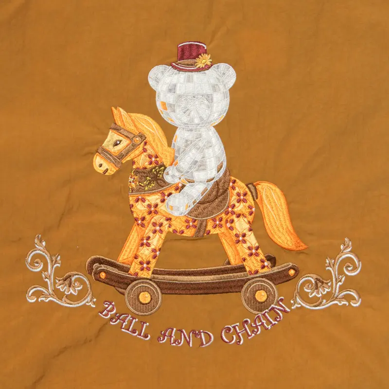 Ball&Chain(ボールアンドチェーン)で人気のクマのキャラクター・ボルチェくんの新デザイン「ROCKING HORSE(ロッキングホース)」。木馬に乗ったボルチェくんの愛らしい姿を、繊細な刺繍で立体的に表現しました。温かみのあるキャメルカラーが、装いにさりげない上品さを添えてくれるエコバッグです。
