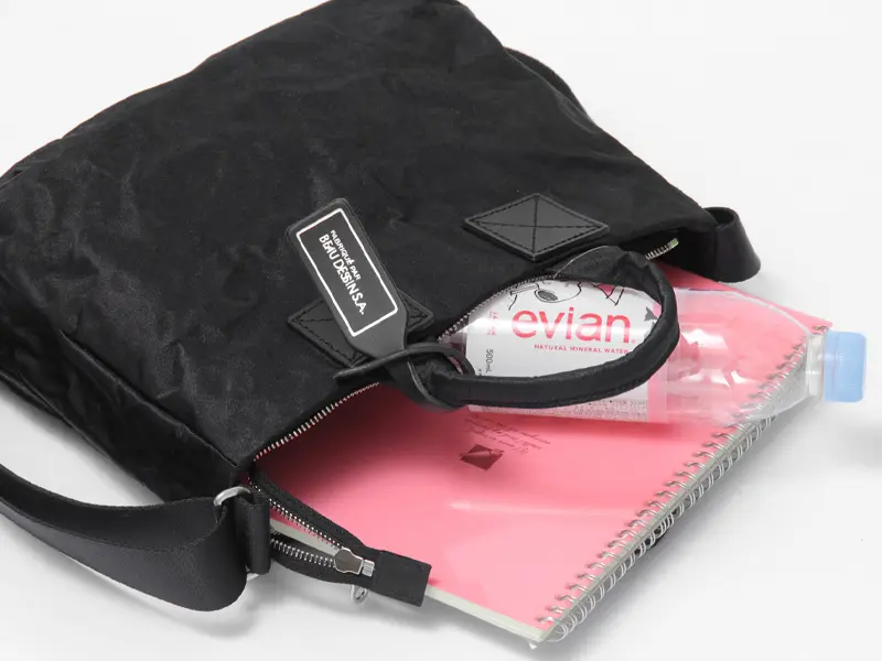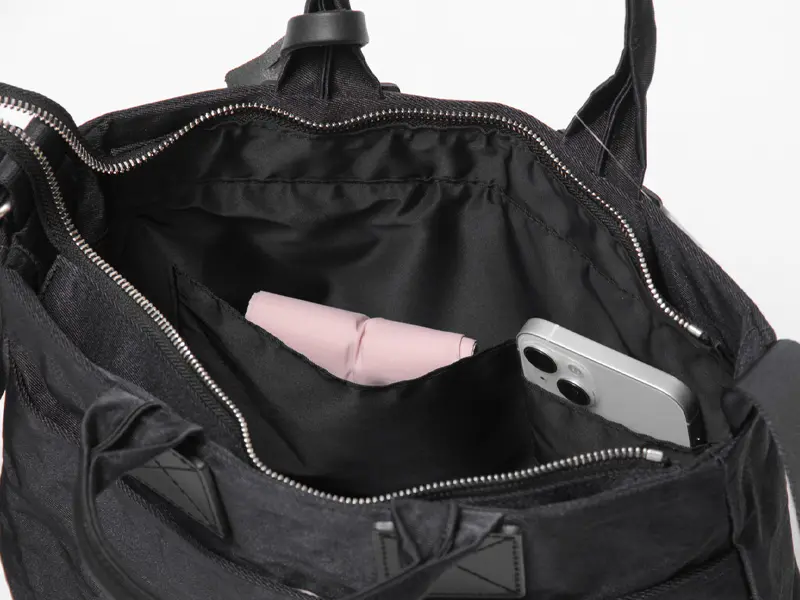 開口部は安心のファスナー仕様。 ペットボトルや折り畳み傘はもちろん、B5ノートや11インチのタブレットまでが無理なく収まります。