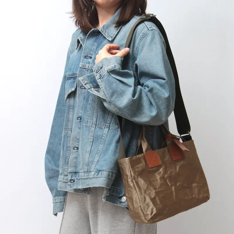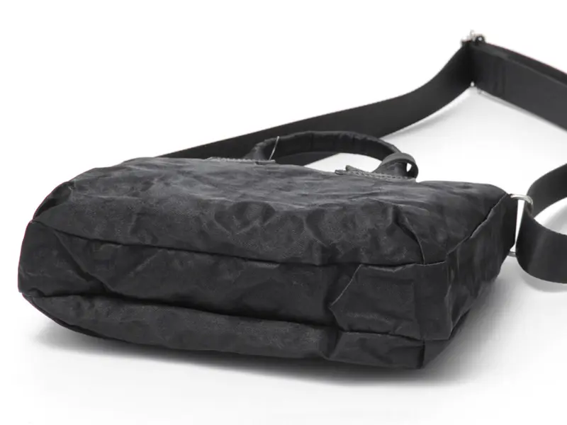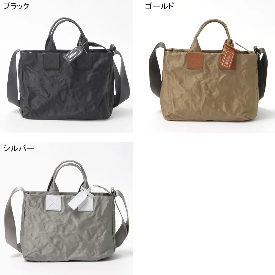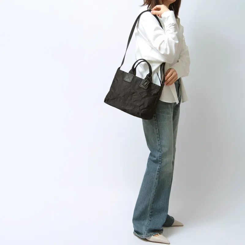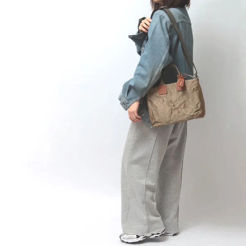 いつものコーディネートに洗練された華やかさを添える、アルミボンディングの柔らかな輝き。 ナイロンの裏に薄いアルミを貼り合わせ、あえてクシャッとしたシワを刻むことで、紙のような趣のある表情を引き出しました。 三層構造による高い耐久性と、手にした瞬間に驚くほどの軽さを両立。 使い込むほどに素材が馴染み、あなただけの繊細な風合いへと育つ経年変化も魅力です。 熟練の職人が一点一点命を吹き込んだ、手仕事のぬくもりを感じるバッグです。