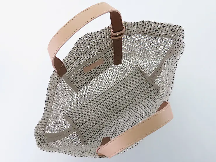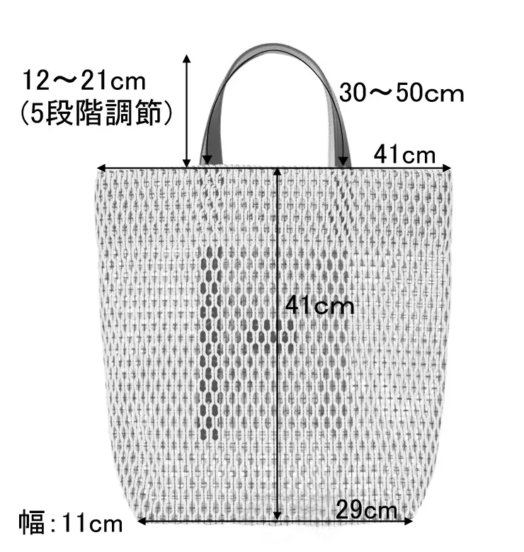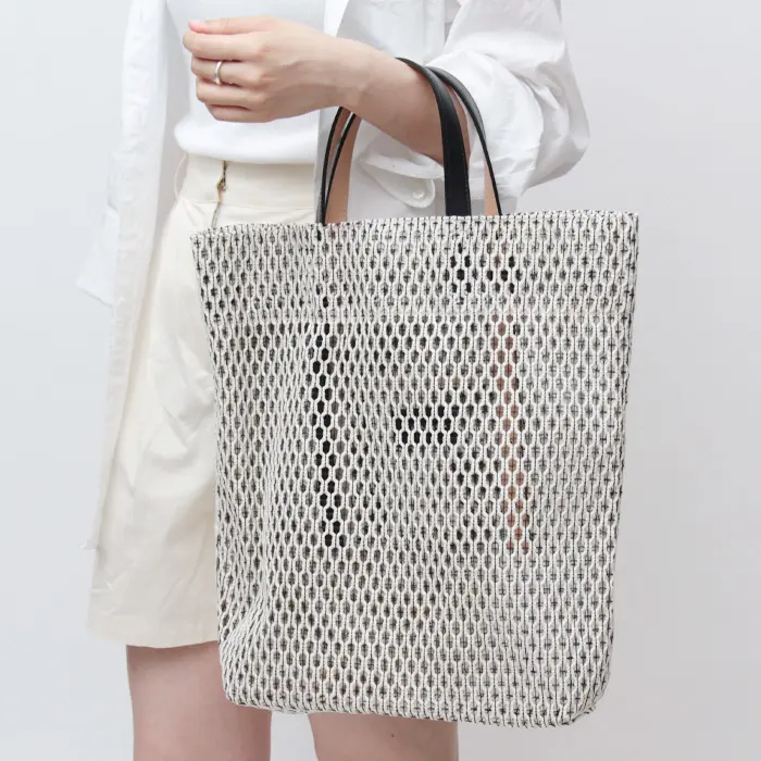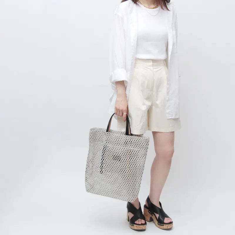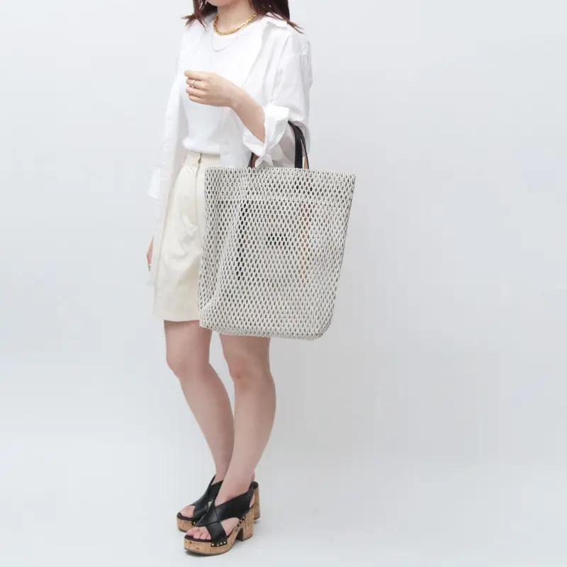 適度なハリと通気性を備えたコットンメッシュを用いた、MARY AL TERNA(メアリオルターナ)の2wayトート「GAP」。メッシュ特有の軽やかさがありながら、中身が過度に透けにくく、日常使いしやすい仕上がりです。 アクセントになるレザーハンドルは長さ調節が可能で、手持ち・肩掛けのどちらにも対応。カジュアルからきれいめまで馴染みやすく、普段のお出かけはもちろん通勤シーンにも活躍します。