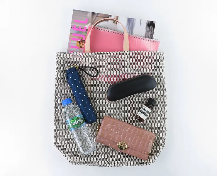 毎日のスタイルに取り入れやすいメッシュトート。しっかりとしたコットンメッシュ素材を採用し、軽さと安心感のある使い心地を両立しています。本体重量は約220gと非常に軽量ながら、収納力も十分。デイリーバッグに求められる条件をバランスよく備えた、頼れるアイテムです。