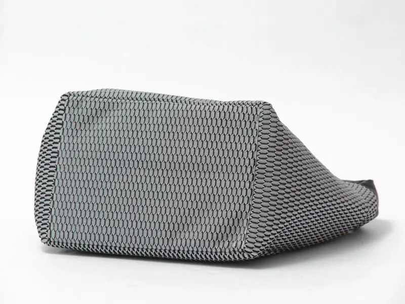 本体生地のメッシュWBには、福井県でスポーツシューズ用メッシュなどを手掛けるメーカーの素材を使用しています。ポリエステル100%で、非常に軽く、優れた耐久性を備えています。クッション性がありながら引っかかりにくく、日常使いでも安心です。見る角度によって白っぽくも黒っぽくも表情を変え、立体的なメッシュ構造ならではの奥行きと魅力を感じられる素材です。