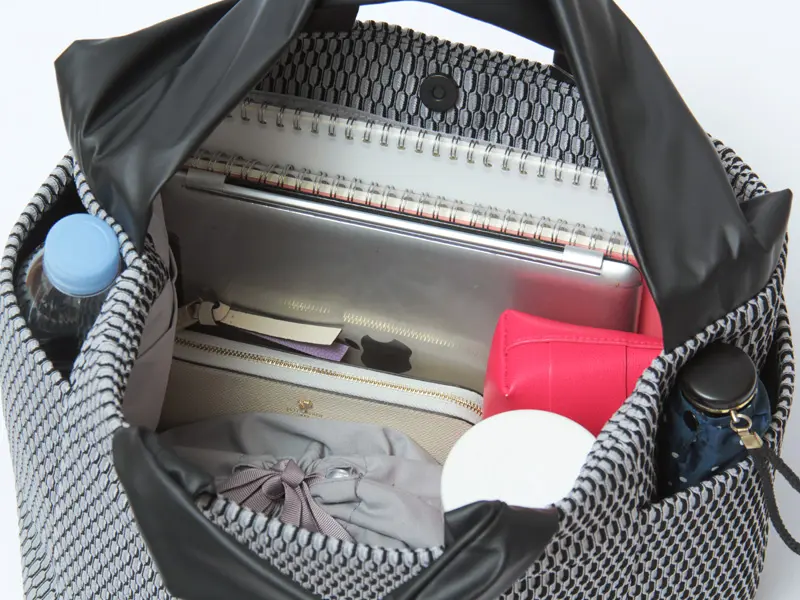 開閉はマグネット仕様で、スムーズに出し入れが可能。必需品に加え、A4サイズのノートがぴったり収まるサイズ感。500mlのペットボトルや折り畳み傘、マチがあるためお弁当箱も無理なく収納できます。