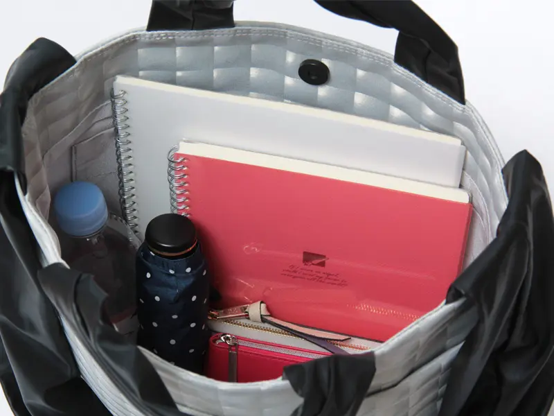 開閉はマグネット仕様。必需品に加え、A4サイズのノートやタブレットがきれいに収まるサイズ感。500mlのペットボトルや折り畳み傘も無理なく収納でき、マチが大きすぎないため、書類やパソコンを入れてもすっきり持てます。通勤や外出はもちろん、お稽古事用のバッグとしても重宝します。(※A4サイズのノートはマグネットを留めなければ収納できます。)