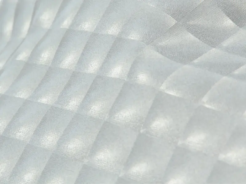 ソファーの張り地として開発されたPVC素材を使用しているため、汚れに強く、安心してお使いいただける大人気の素材です。白色でありながら、お醤油をこぼしても問題ありません。しなやかなPVC生地をベースに施されたレンズ柄は、特殊プリントとエンボス加工を完全に一致させる必要があり、機械任せでは実現できません。 職人が立ち会いながら細部まで確認する、日本製ならではの繊細な製法によって生み出されています。パールのような上品な光沢が華やかさを添え、黄変しにくい点も魅力です。