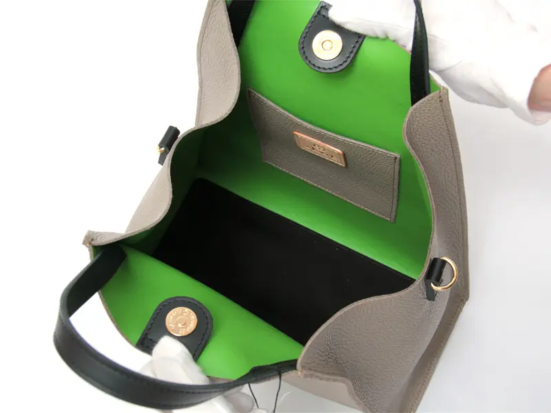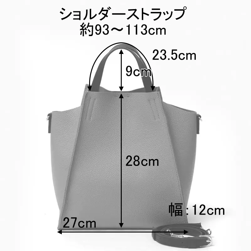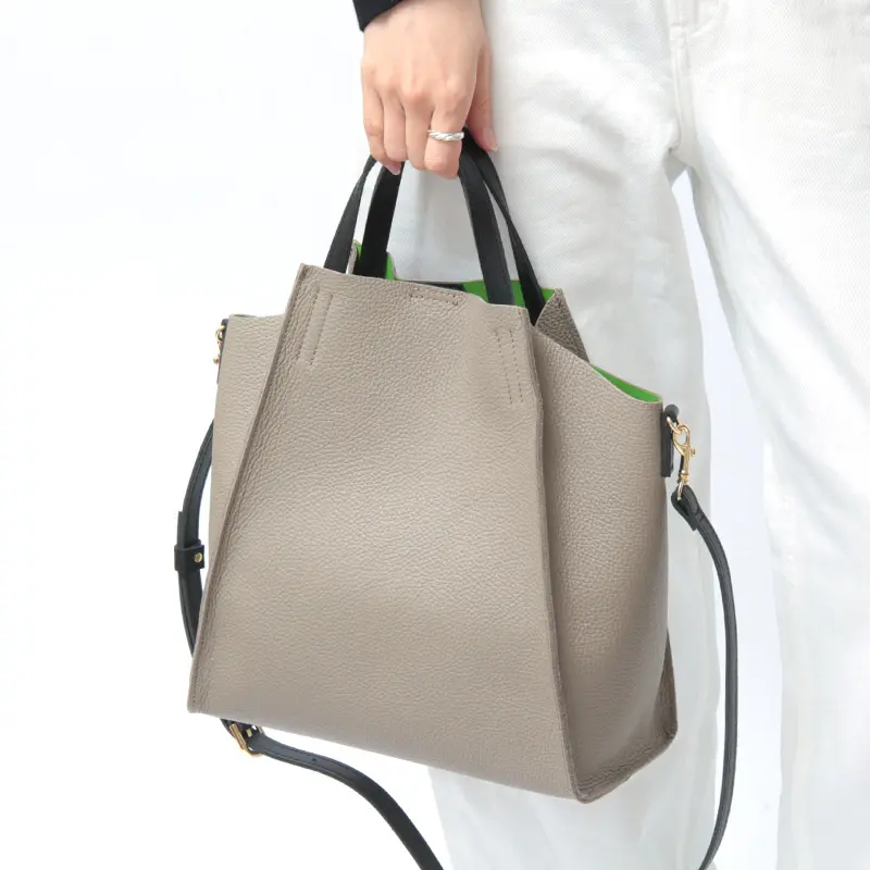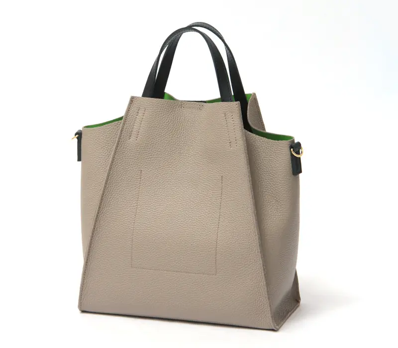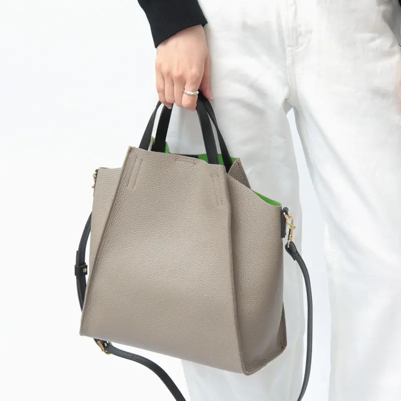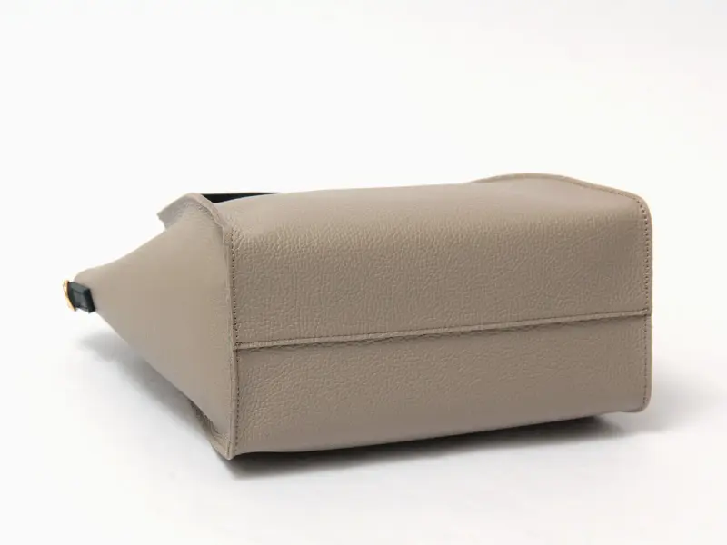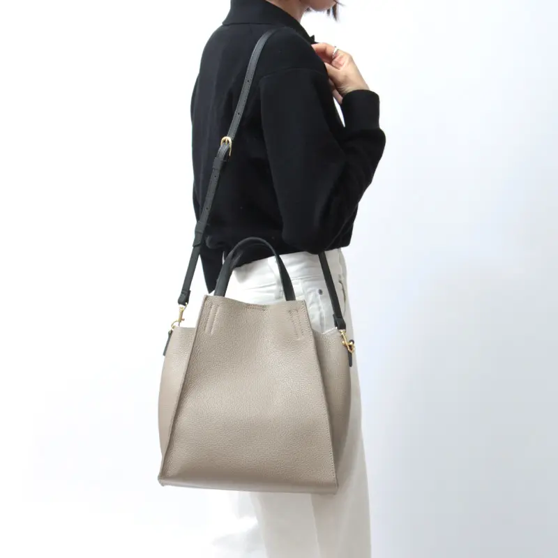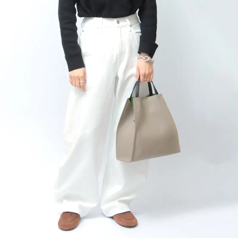 本体には、シボ感のある牛革を使用。傷やシワが目立ちにくく、日常使いしやすいのが特徴です。落ち着いたグレージュカラーが、シンプルなトートバックにやわらかな表情を与えます。ハンドルとショルダーストラップには、滑らかなブラックレザーを採用し、全体を引き締めるアクセントに。裏地を省き、内側にカラーを施した軽やかな仕立ては、革そのものの風合いを楽しめるのも魅力です。素材のコントラストと上質なレザーの質感が、毎日のスタイルに自然と馴染みます。