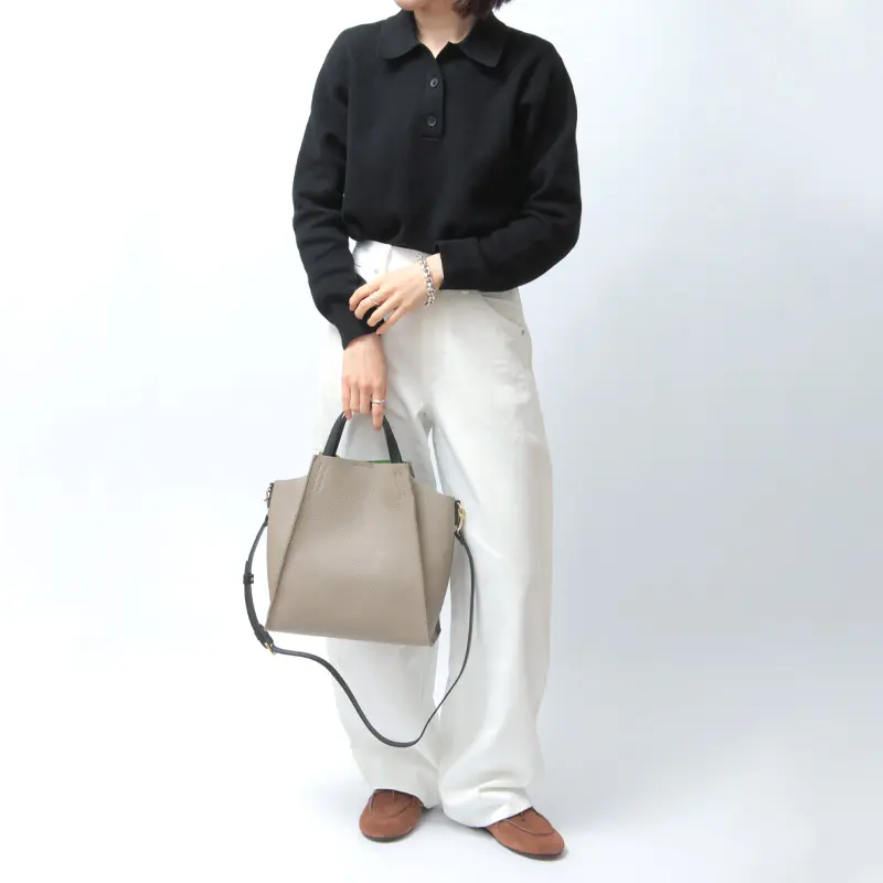 さらに、バッグ上部を内側に入れ込むことで、すっきりとした三角シルエットに変化。シンプルなトート型から表情を変えられるデザインが、装いやシーンに合わせた使い分けを可能にします。