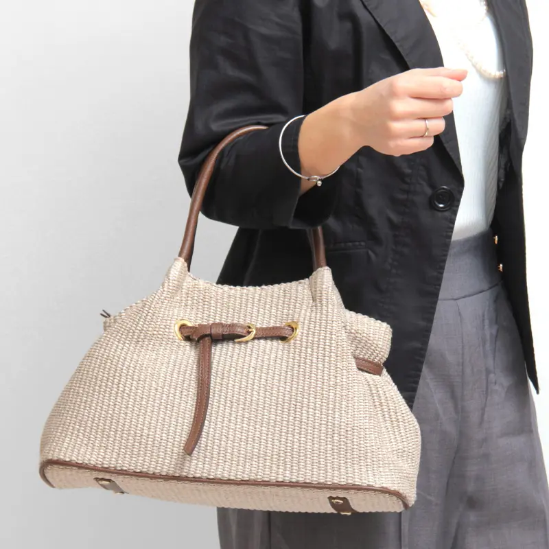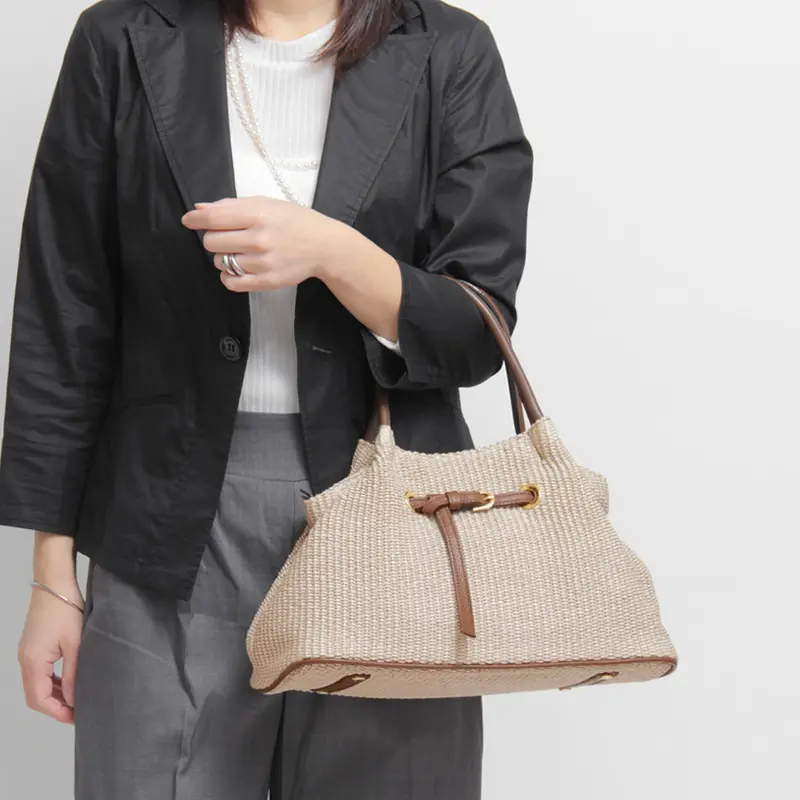 ラフィアのような涼やかな素材感が、春夏コーディネートに季節感をもたらす"VIOLAd'ORO ヴィオラドーロ"のSANDRO。台形フォルムをベースに、フロントのひねり金具がアクセントを添えるシックなデザインです。必需品が余裕で収まる収納力があり、デイリーからお仕事まで幅広く活躍します。