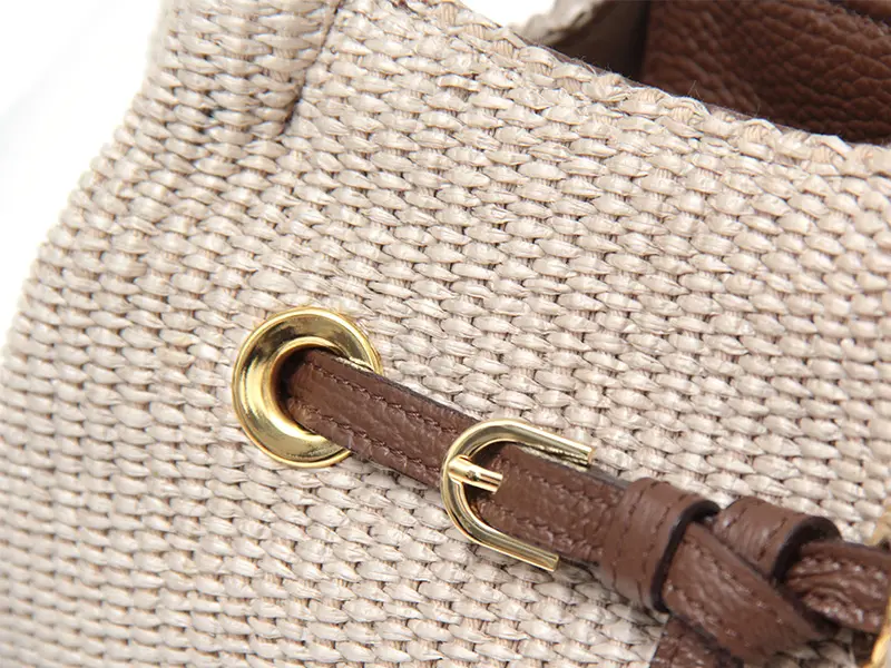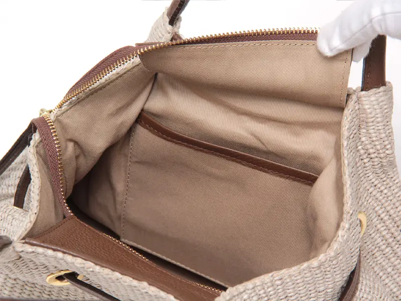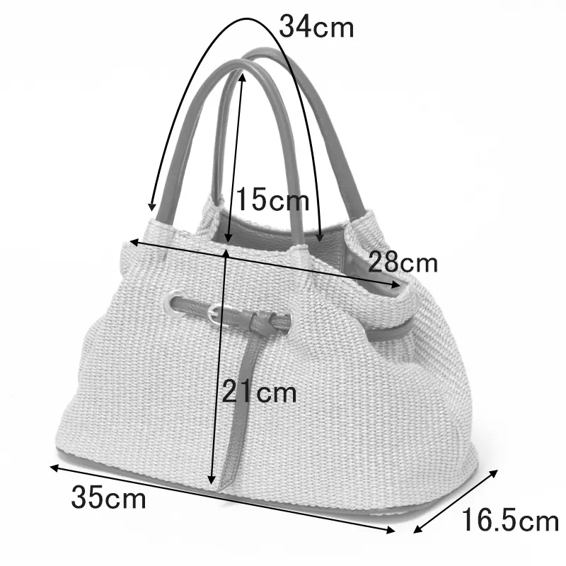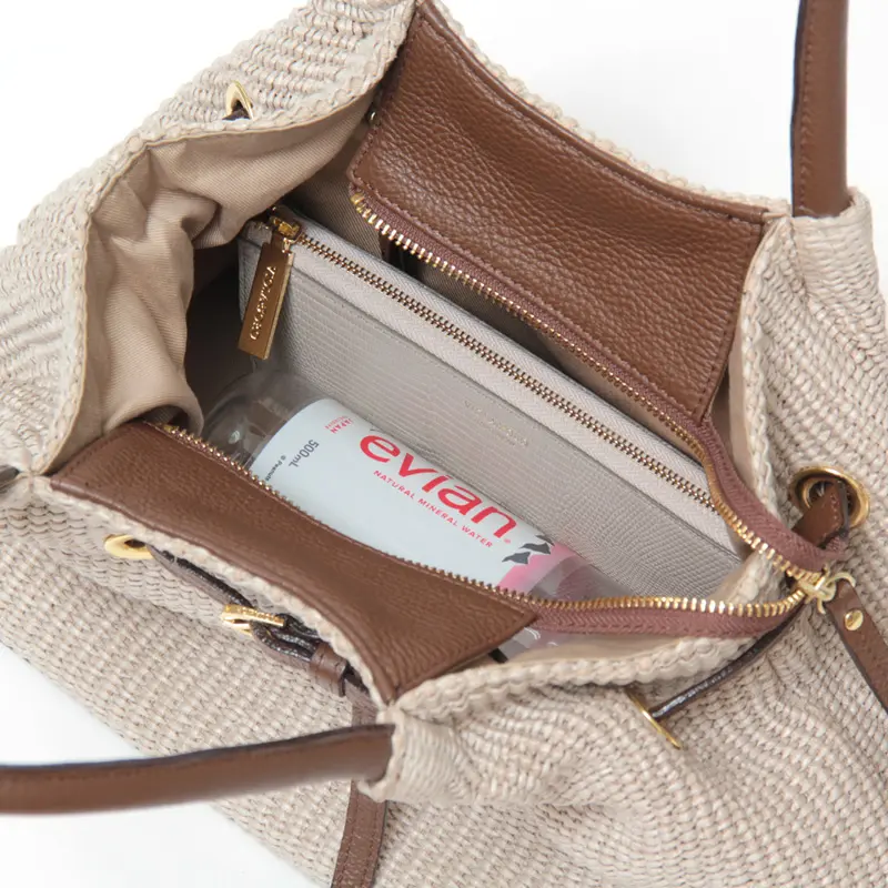本体は、イタリア製のコットン×ポリアミドによるラフィア調シートを採用。手編みのかごバッグにはないクリーンな表情が魅力です。天然素材特有の衣服への「引っ掛かり」がなく、耐久性に優れているのも嬉しいポイント。多少の雨にも強く、毎日気兼ねなくお使いいただけます。
