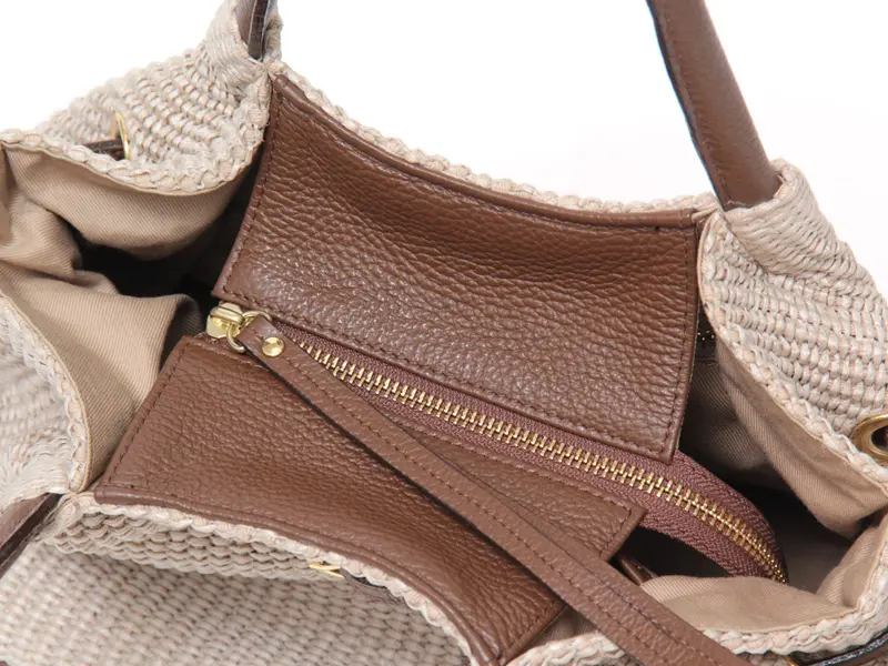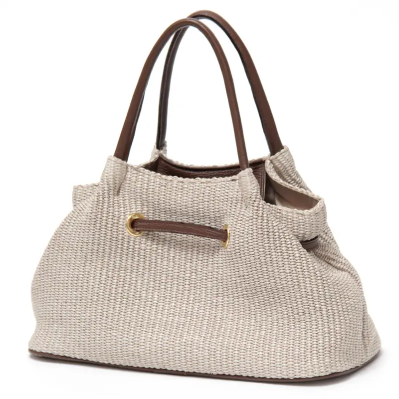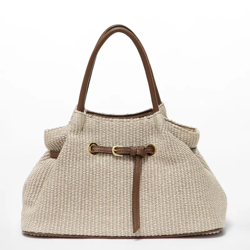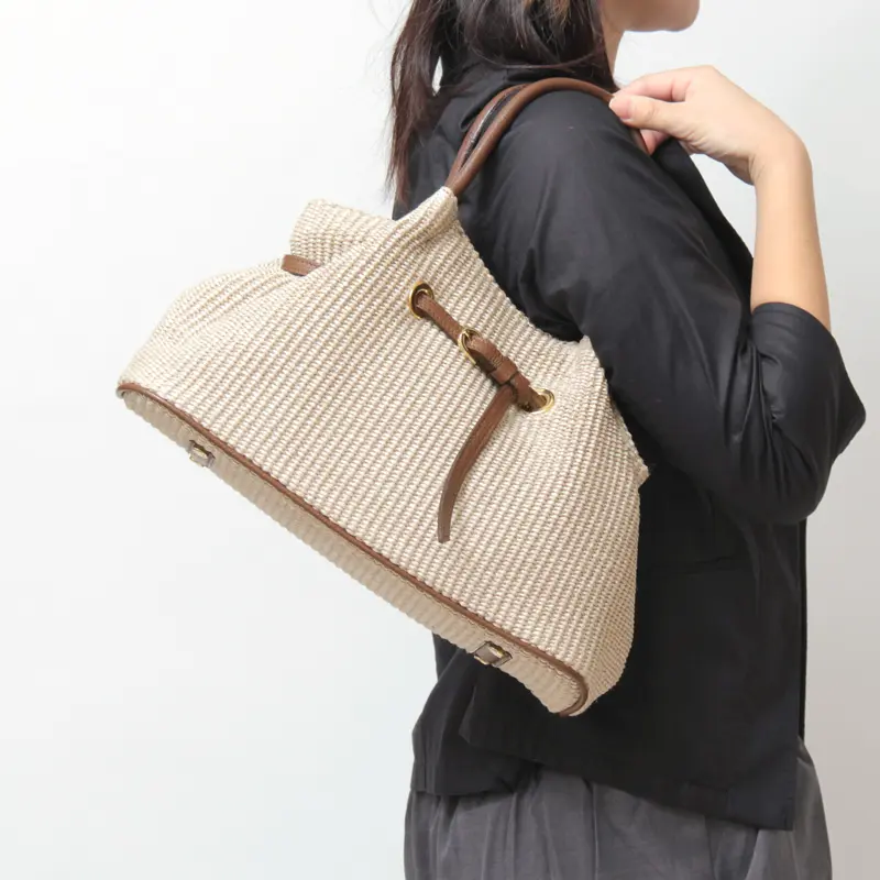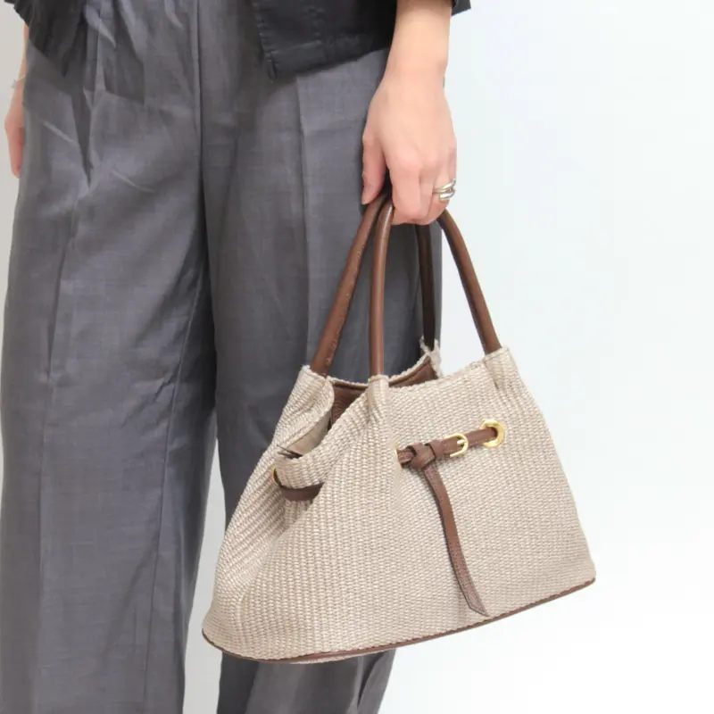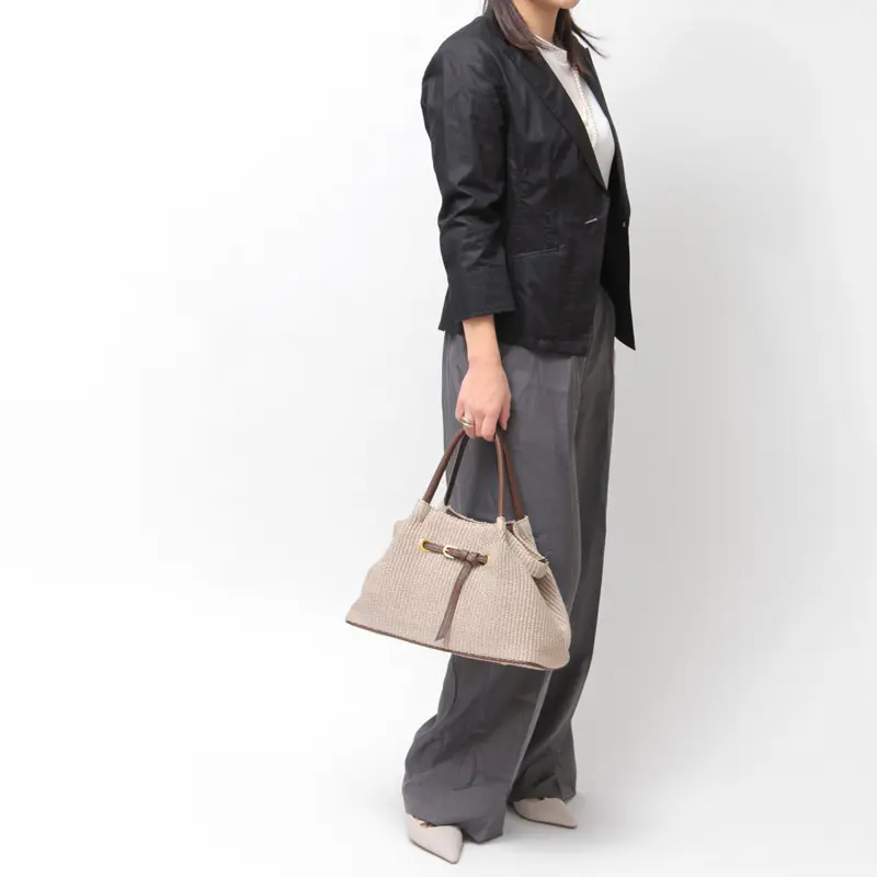 ナチュラルな素材感に上質な牛革(イタリアンレザー)を組み合わせ、ジャケットスタイルや通勤にも馴染む品格をプラス。レザーとのコンビながら驚くほど軽量で、長時間の持ち歩きも快適です。型崩れしにくい素材のため、荷物を入れても美しいシルエットを崩しません。