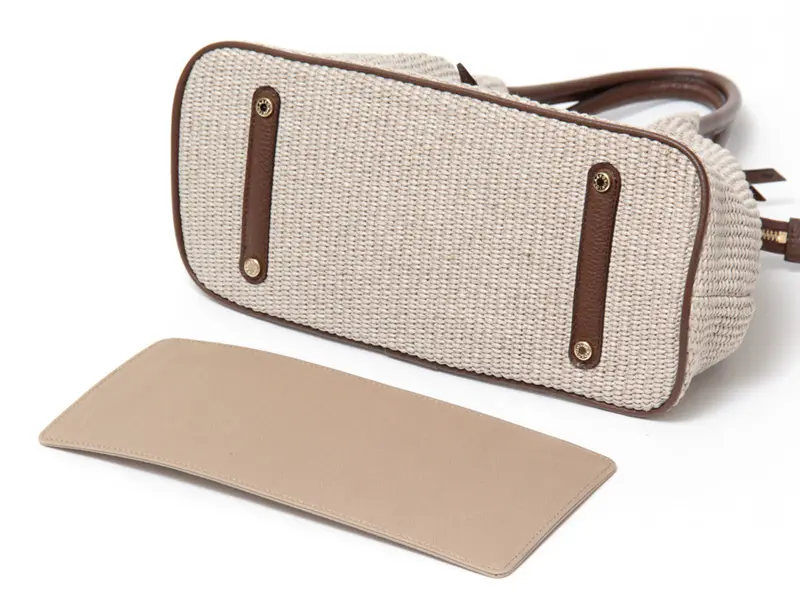 底面には4箇所の底鋲を配し、バッグを置いた際の汚れや擦れをしっかり防ぎます。さらに取り外し可能な底板が荷物の重みを支え、型崩れを防止。底角のパーツにはイタリアンレザーによる補強を施し、耐久性と高級感を両立させました。