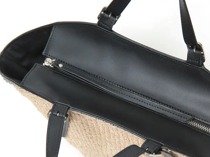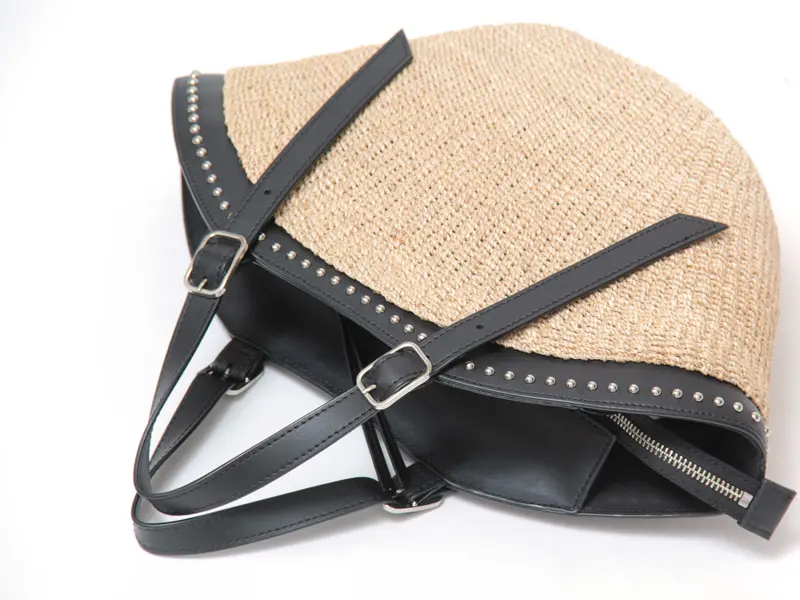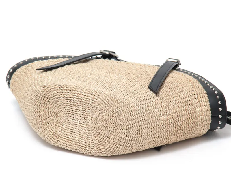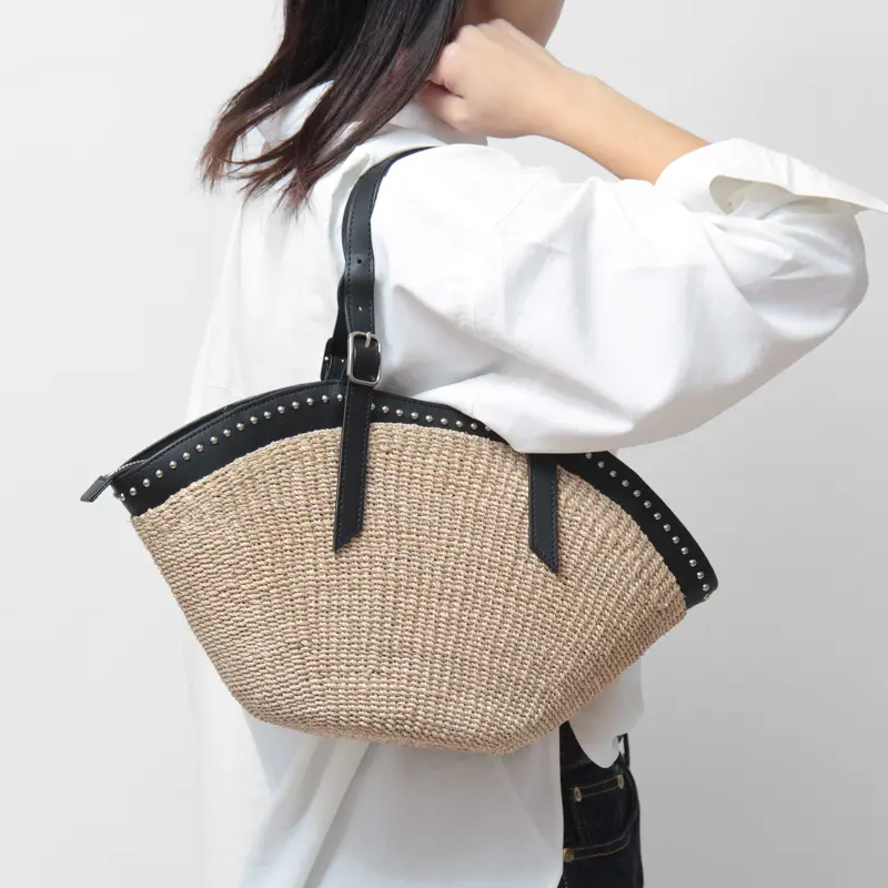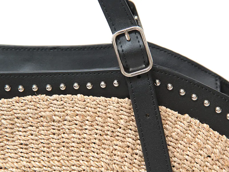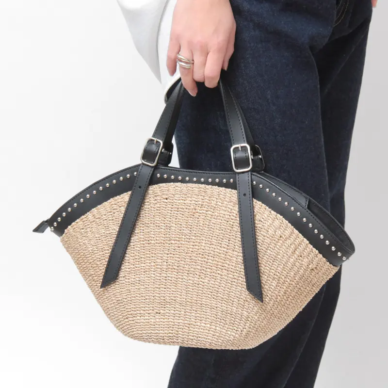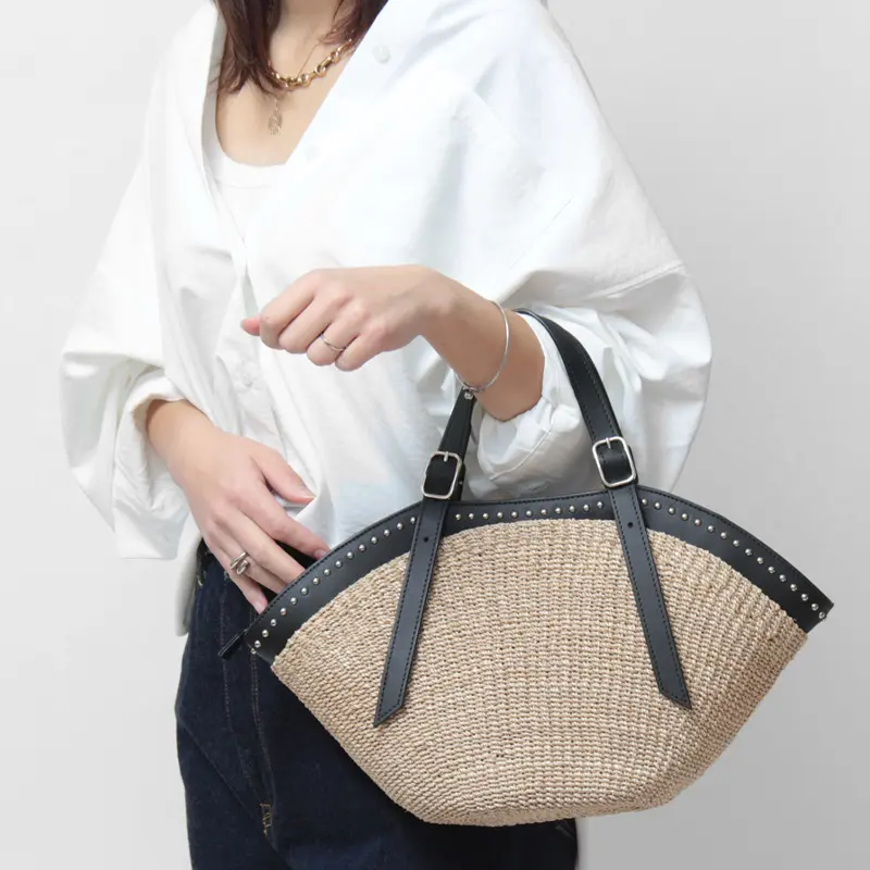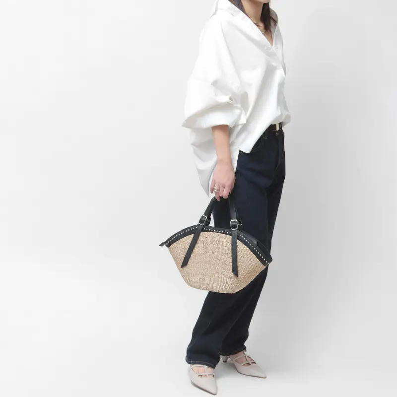 通常よりも網目の細かなファインアバカを贅沢に使用。上質なイタリアンスプレットレザーで縁取ることで、クラス感のある佇まいを実現しました。等間隔に配されたシルバースタッズが、ナチュラルな素材感にモードなエッセンスを加え、大人の女性にふさわしい「かっこよさ」を演出します。