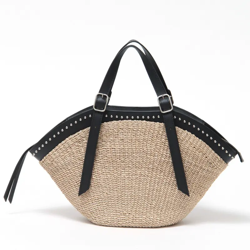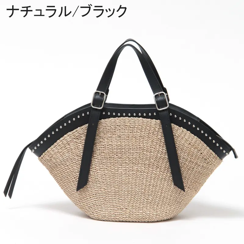 VIOLAd'ORO ヴィオラドーロ MIRO アバカ×レザー スタッズ付き かごバッグ ≪4月初≫ナチュラル/ブラック