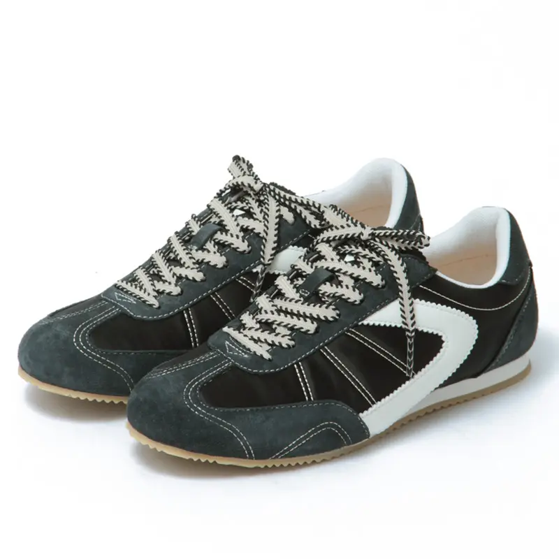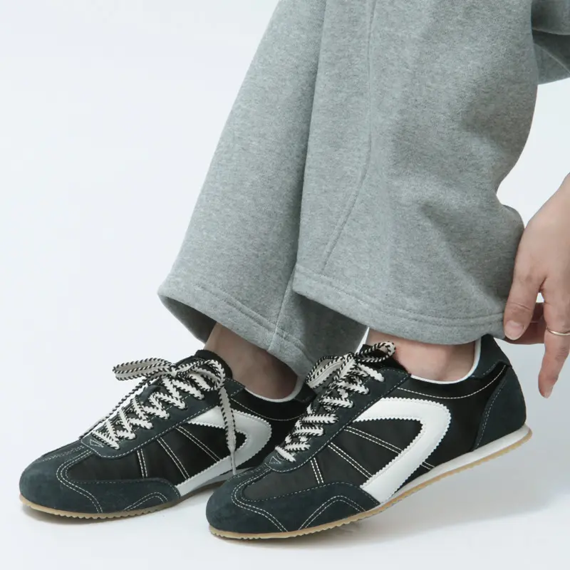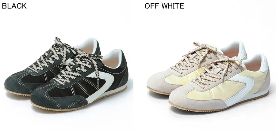 ブラックとオフホワイトの2色展開で、異素材同士のコントラストが、シンプルなデザインの中にさりげない個性を添えています。カジュアルなデニムスタイルから、きれいめなパンツやスカートまで幅広くマッチします。気負わず履けて、自然とスタイリングを引き締めてくれる、毎日に寄り添うスニーカーです。