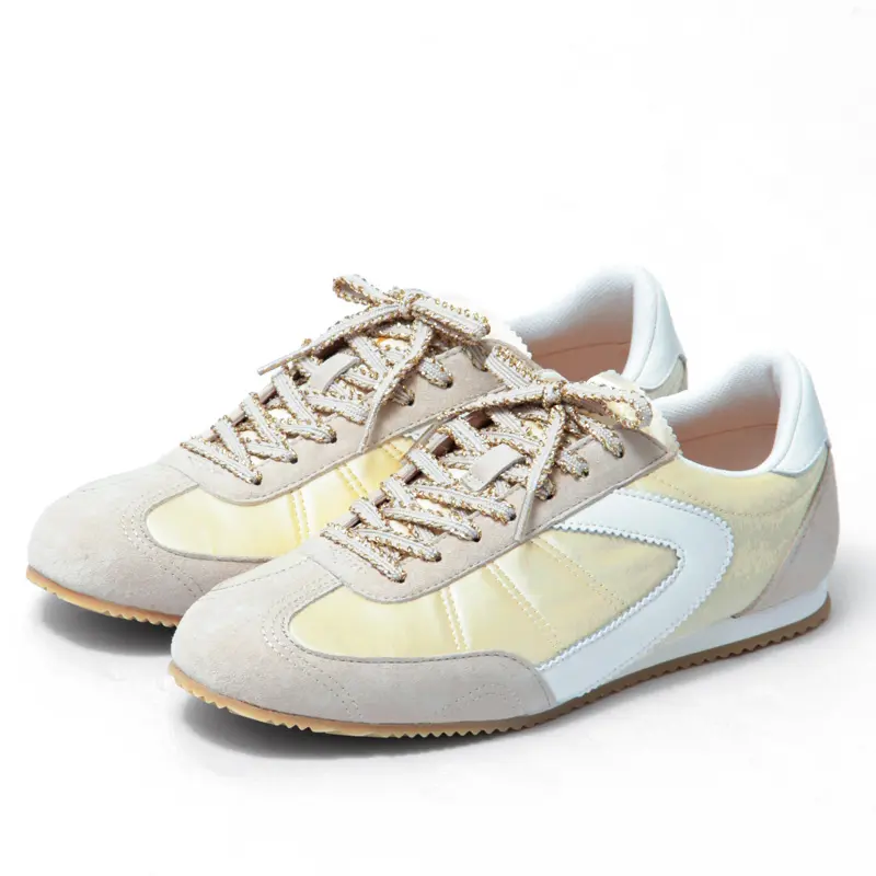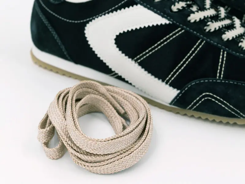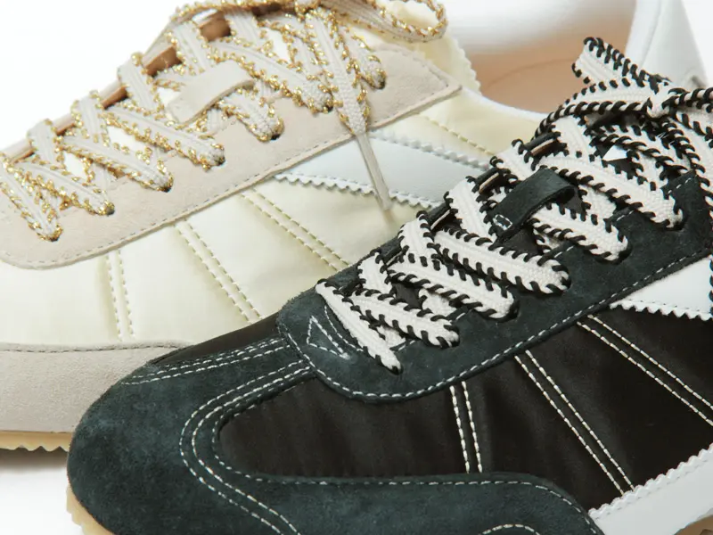 サテン、スエード、スムースレザーの異素材ミックス仕様。アッパーには、上品な光沢をもつサテン素材を使用。光の当たり方で表情が変わり、カジュアルなローテクスニーカーでありながら、どこか洗練された印象に。シューレースは、ブラックにはコントラストの効いたステッチ、オフホワイトにはゴールドのステッチが入っており、シンプルなローテクスニーカーにさりげない華やかさをプラスします。
