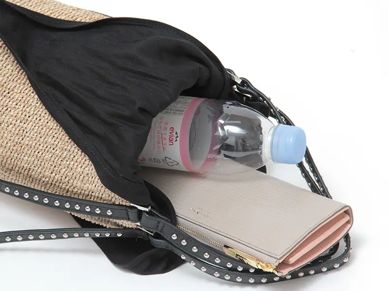 開口部はスカーフのようにリボン結びができる巾着タイプ。中身をしっかり隠せるので、人混みでも安心してお使いいただけます。内側にはオープンポケットを備え、鍵やパスケースなどの小物の整理もスムーズです。