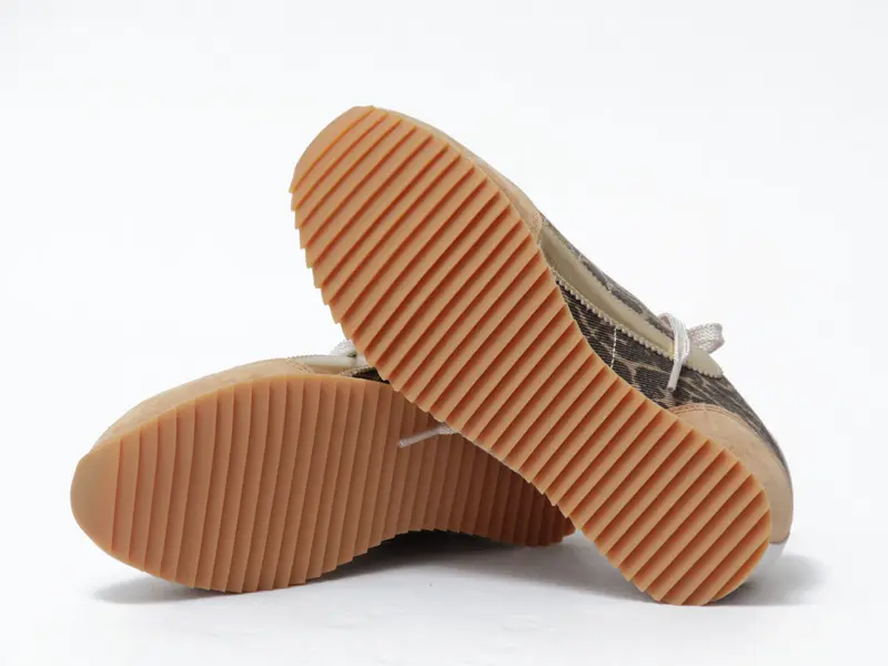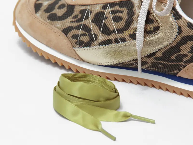 本体はひょう柄のプリントテキスタイルを使用。トゥやシューホール周りには、柔らかなスエードレザーを配置。足当たりがよく、素材の切り替えによって全体のシルエットを引き締めています。さらに、サイドにはさりげなく光を受けるメタリックレザーを組み合わせ、控えめながらも華やかさをプラス。