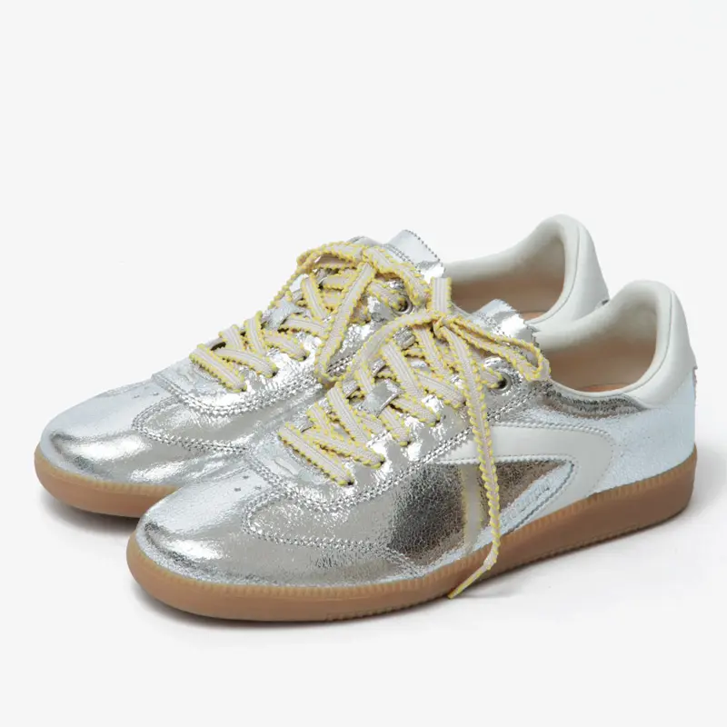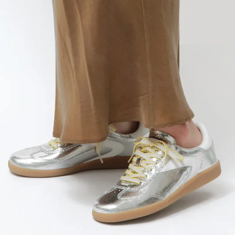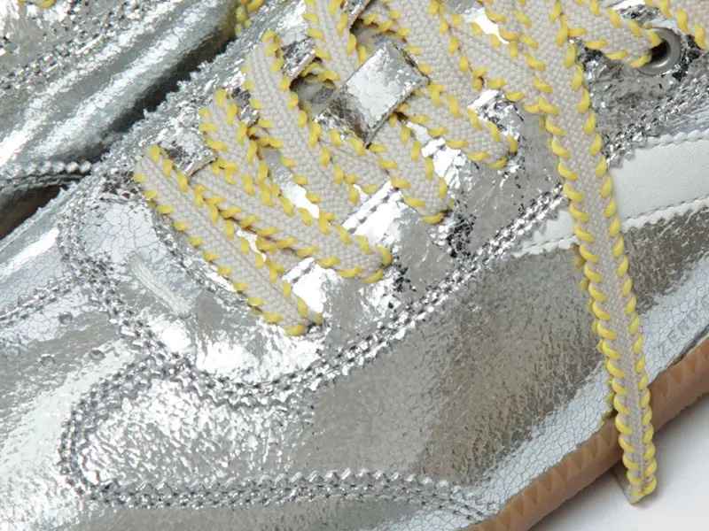 【GALAXY】ひび割れ加工を施したメタリックレザーが目を引く存在感のある仕上がり。光を受けて表情を変えるシルバーに、スムースレザーを組み合わせることで、主張しすぎないバランス感を実現しています。イエローを効かせたシューレースが足元に軽快なアクセントを添え、シンプルなコーディネートを一気に新鮮な印象へと導きます。