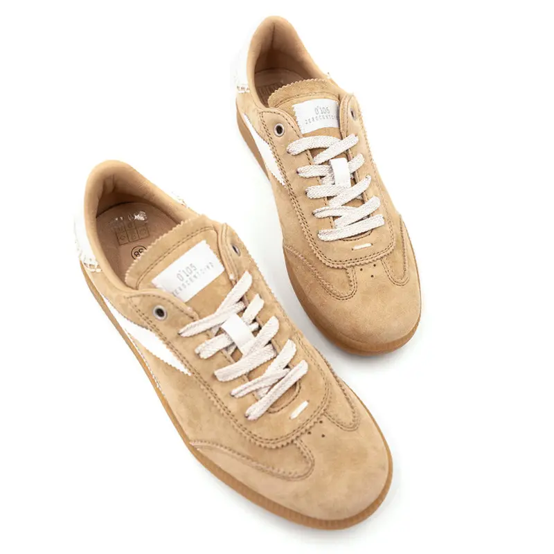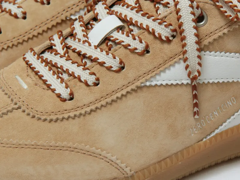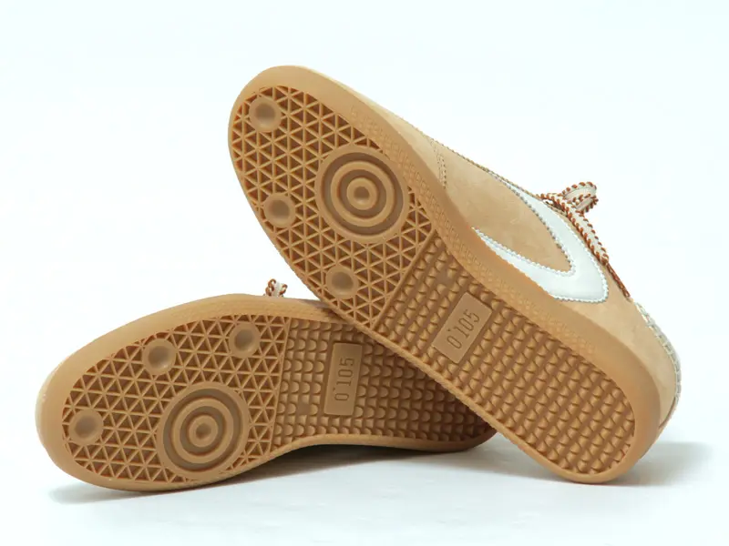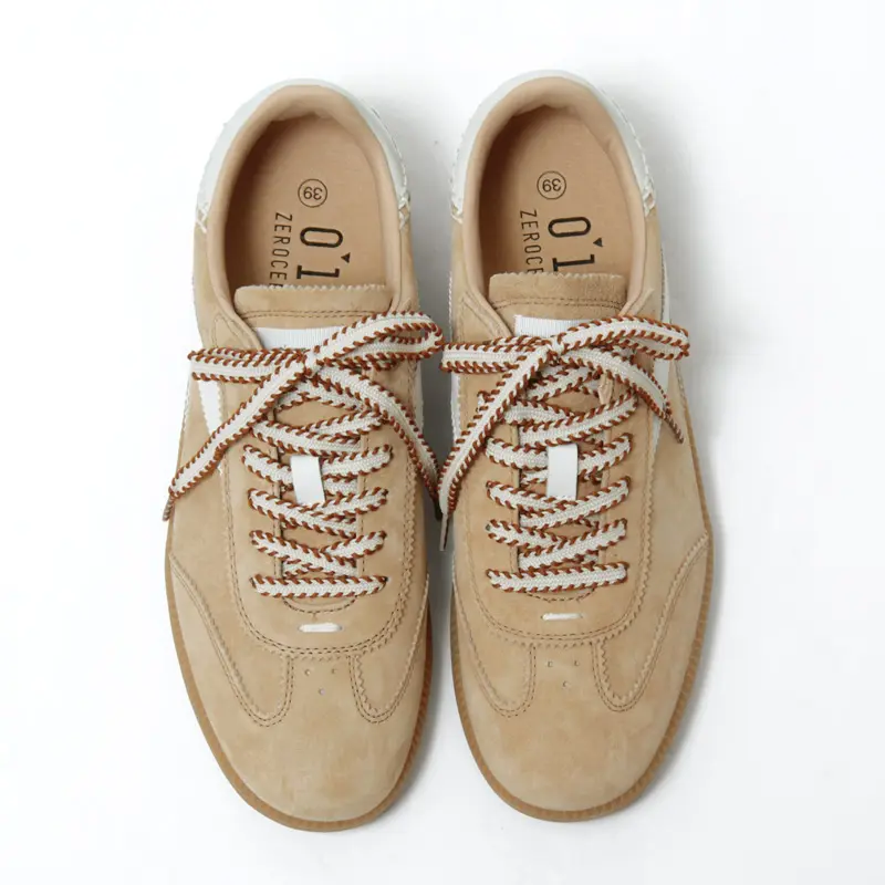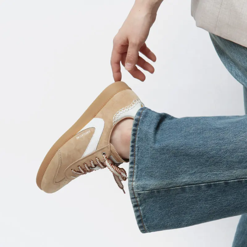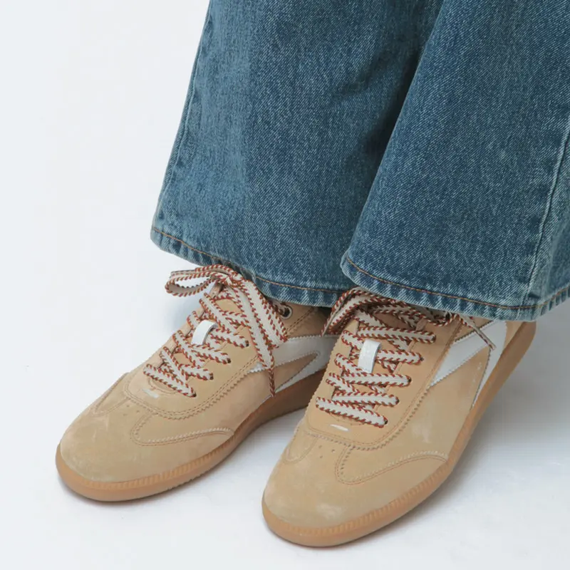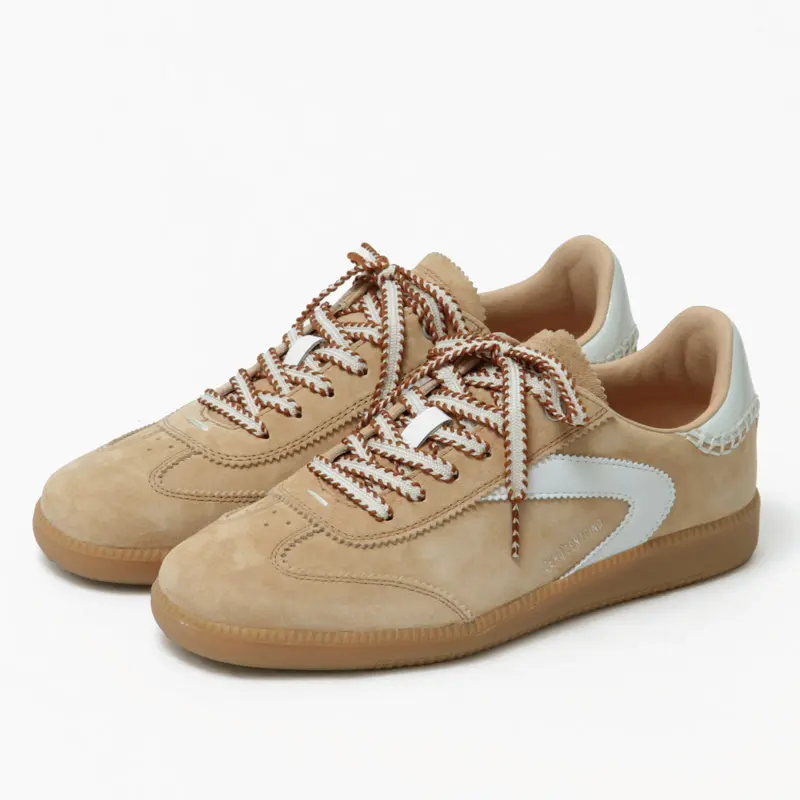 【TERRY】夏の砂浜を思わせる深みのあるキャメルカラーが印象的。起毛感のあるスエードにホワイトレザーを組み合わせることで、温かみと奥行きのある表情に仕上げています。キャラメルカラーのガムソールが全体をやさしくまとめ、ナチュラルでタイムレスな一足に。