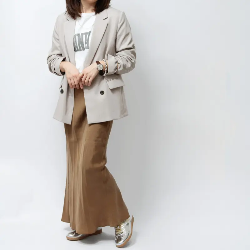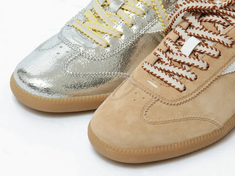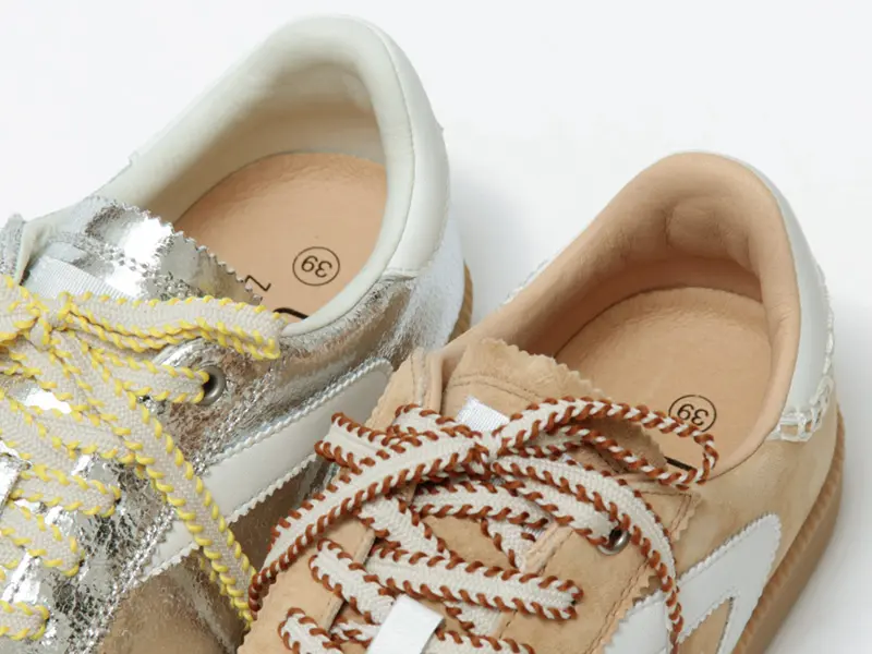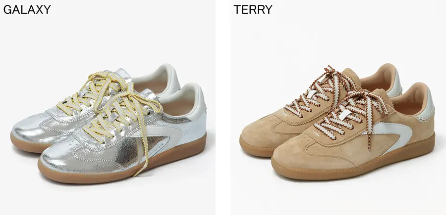 TERRYカラーは、ナチュラルなキャメルカラーが足元にやさしい存在感を添え、履くだけで装いに抜け感をプラス。GALAXYカラーは、メタリックレザーが目を引き、シンプルなコーディネートを一気にモードな印象に。気負わず履けて、日常のスタイリングを上品にまとめてくれるスニーカーです。
