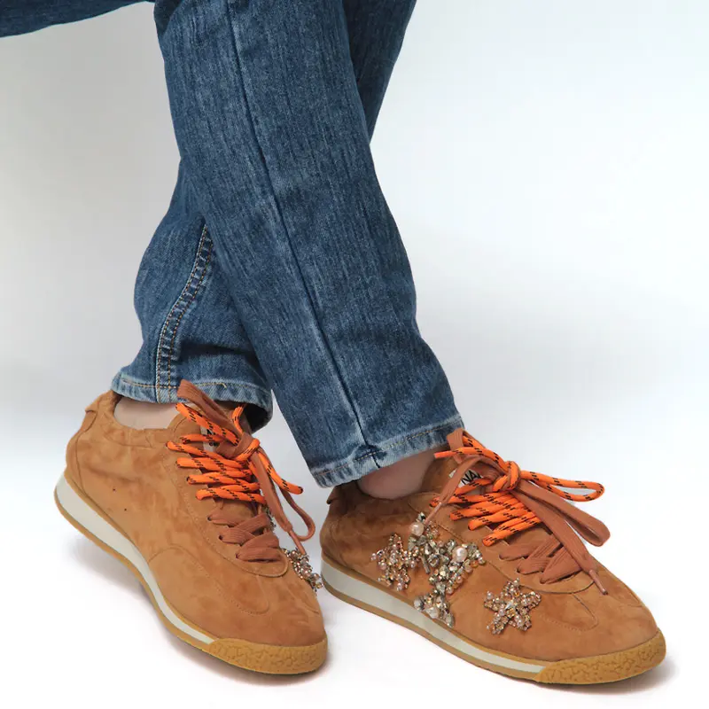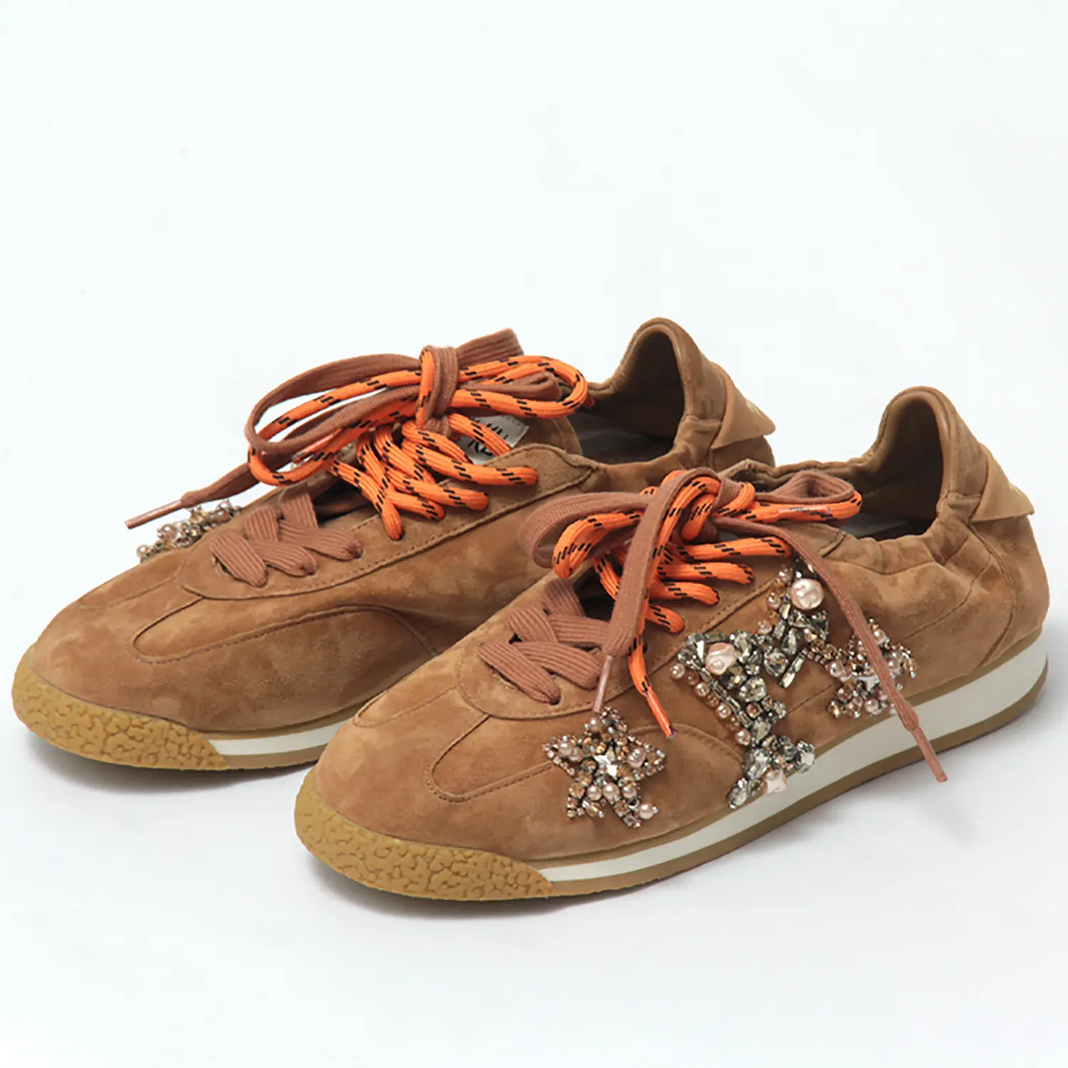 NAN-KU Couture ナンク クチュール スエード×ビジュー ダブルシューレース スニーカー CAMEL