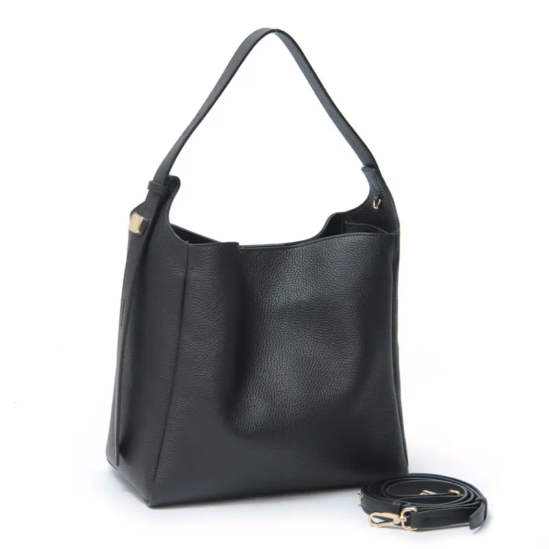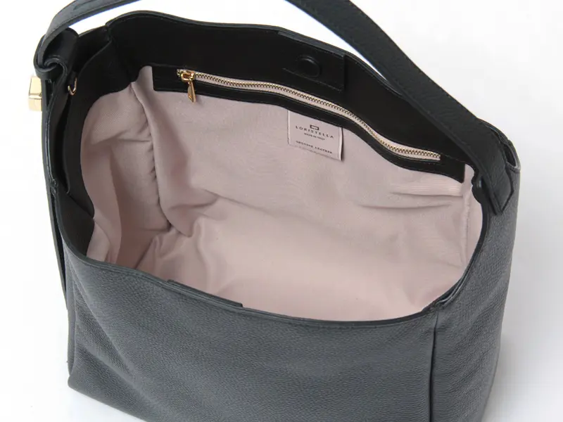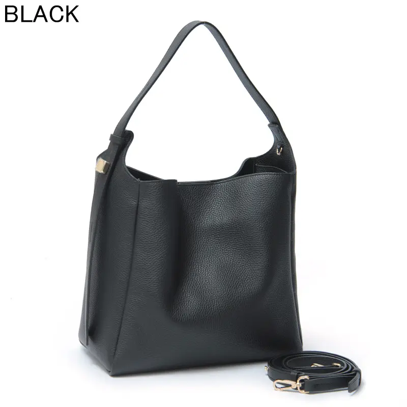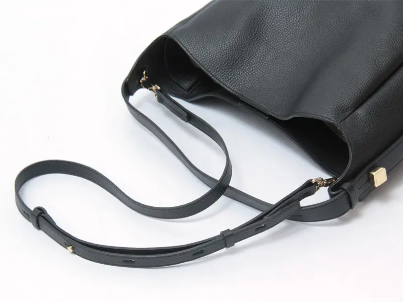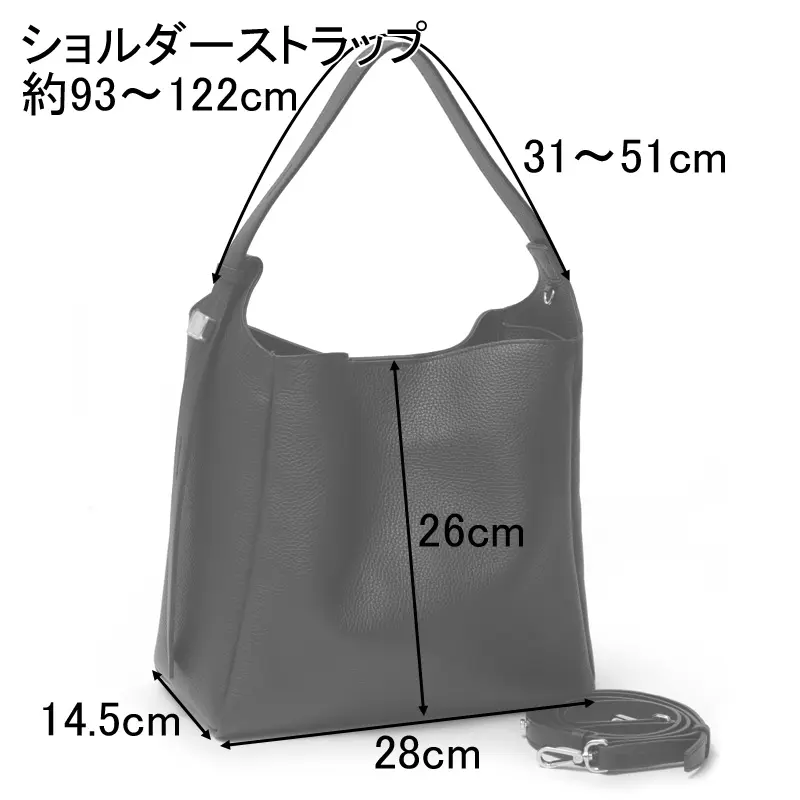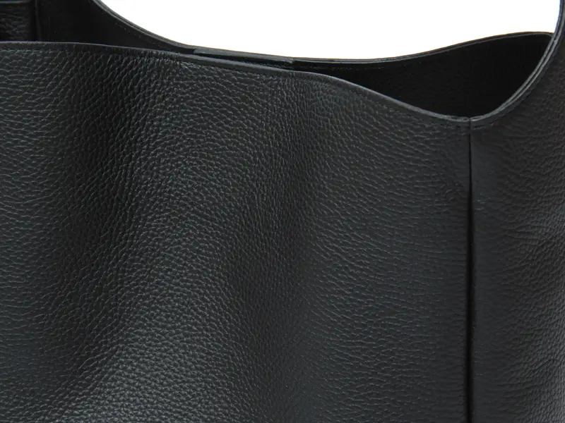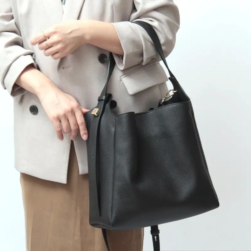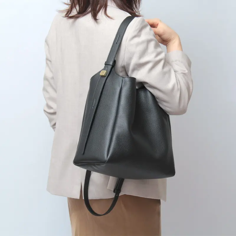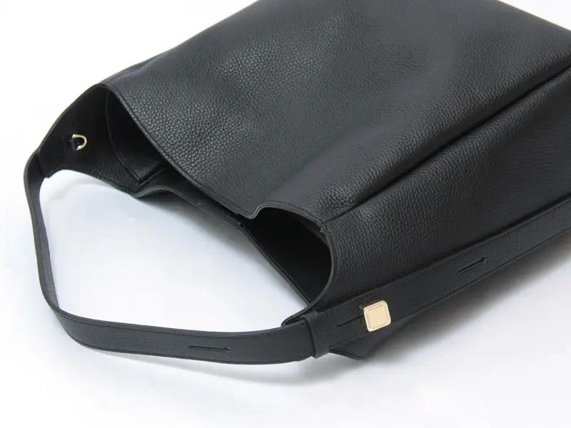 イタリア製シュリンクレザーを使用した、上品で柔らかな質感のショルダーバッグ。程よいハリ感でスクエアフォルムを美しく保ちつつ、手に取るとやさしくしなやかに馴染みます。シボ感のある表情は傷や汚れを目立ちにくく、デイリー使いでもきれいな印象を長く保ちます。落ち着いた黒のレザーはシックで洗練された印象を与え、大きめサイズながら端正な佇まいで、通勤から休日のお出かけまで幅広く活躍する、大人のためのバッグです。