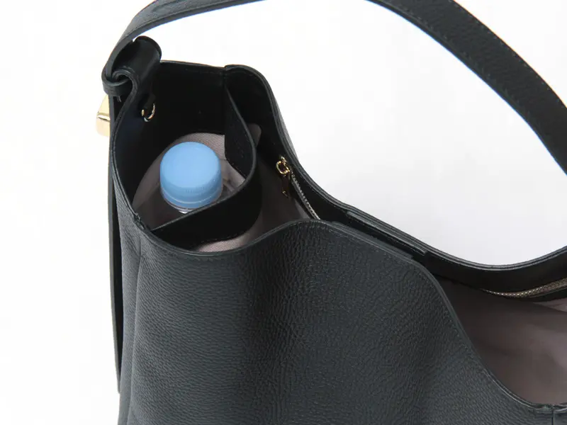 また両サイドには縦長ポケットを配置し、ペットボトルや折り畳み傘など長さのあるアイテムもすっきり収納可能。バッグを閉じたままでも取り出せる便利なポケットです。