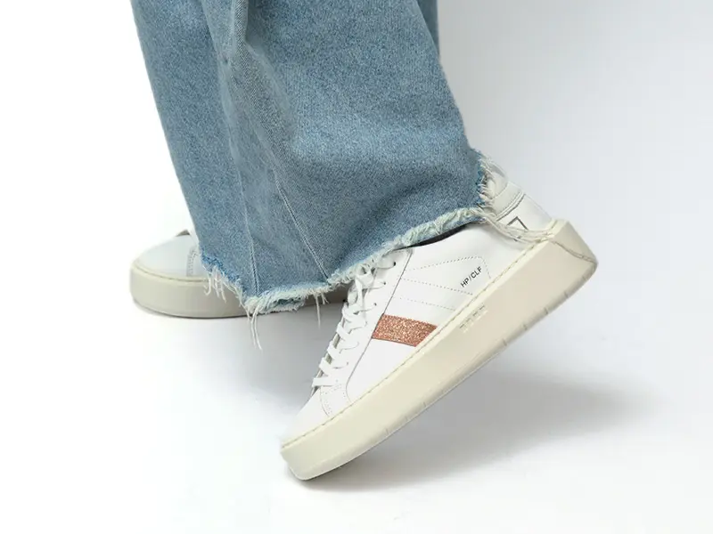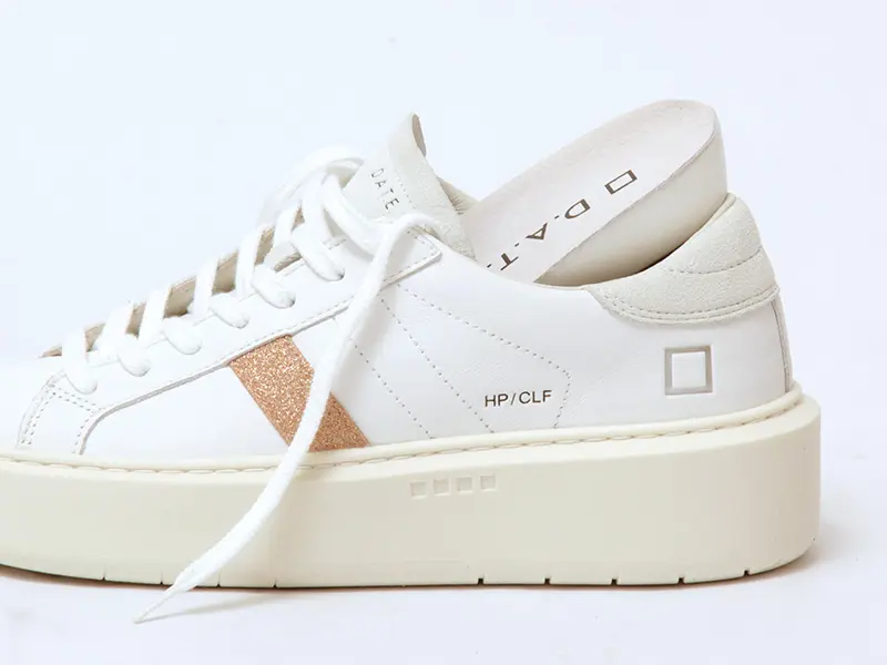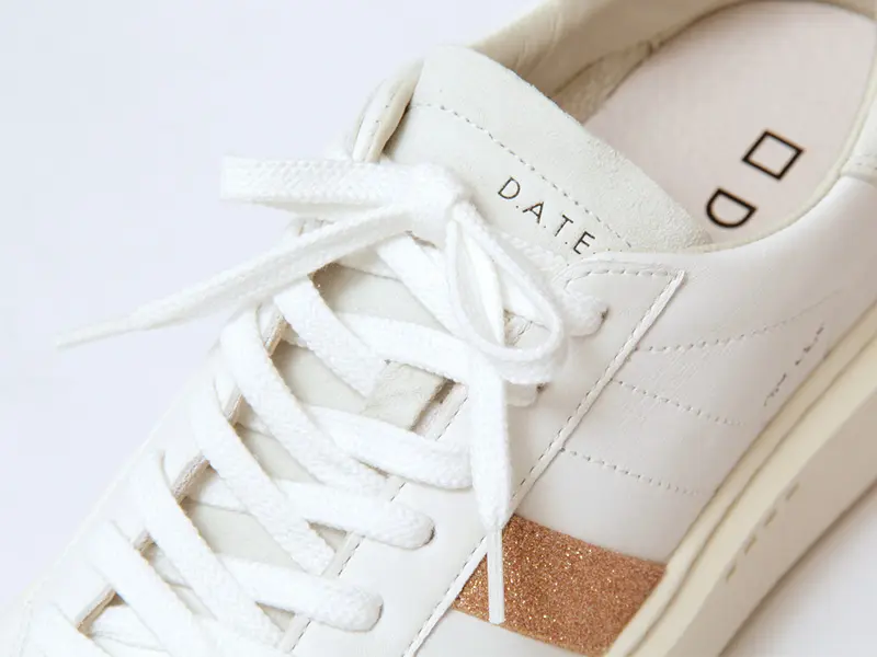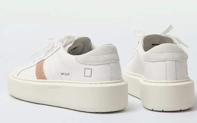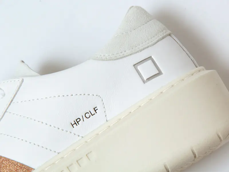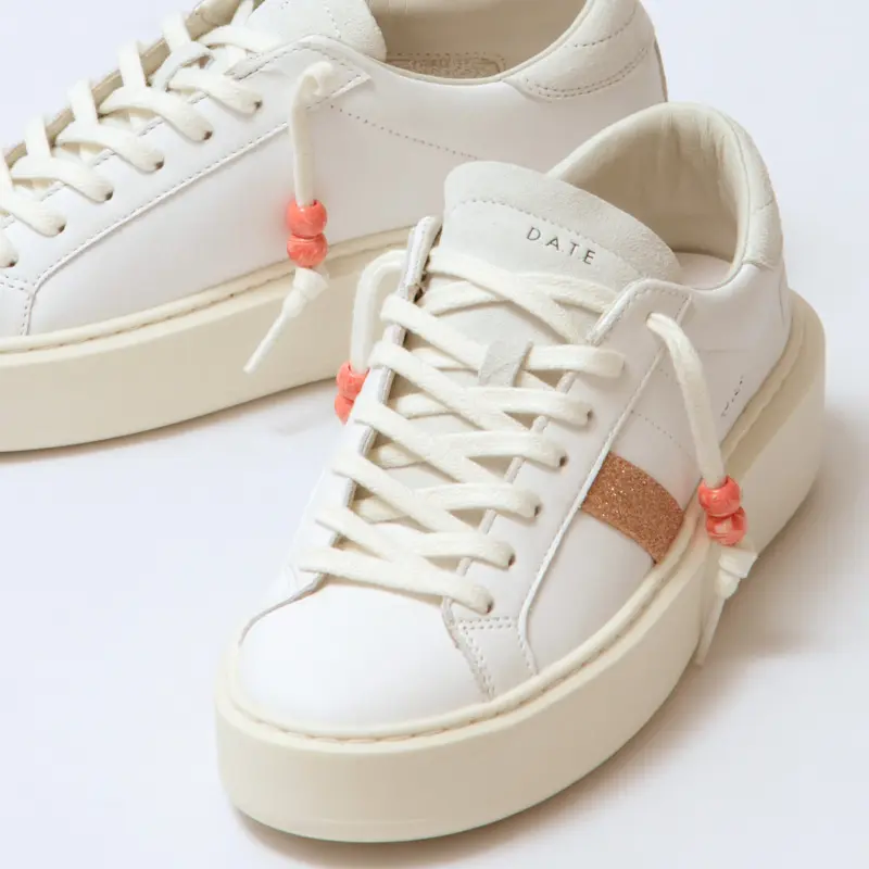 ホワイトレザーにピンクのグリッターラインが美しく映えるデザイン。サイドに刻印されたD.A.T.E.のスクエアロゴが洗練された存在感を放ちます。踵やシュータンには柔らかなヌバック素材を配し、異素材のコントラストで奥行きのある表情に。