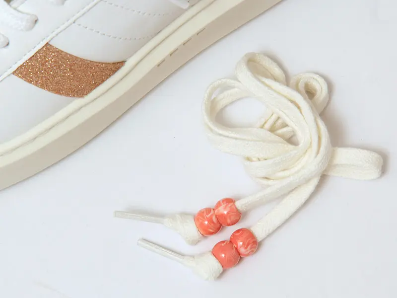 本来の仕様である「ビーズ付きシューレース」も付属としてお付けします。コーラルカラーのビーズが揺れるデザインは、遊び心たっぷりでアクセサリーのような華やかさです。