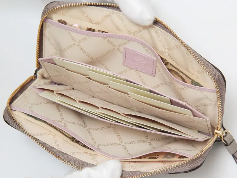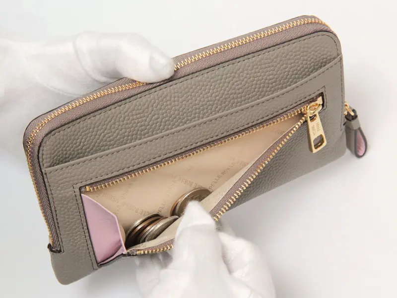 見た目以上の収納力を備えながら、厚みを抑えたスマートな設計が魅力。ラウンドファスナーを開けるだけで中身がひと目で見渡せ、カードもお札もスムーズに取り出せます。動作を最小限に抑えた設計で、支払いの所作まで美しく整います。