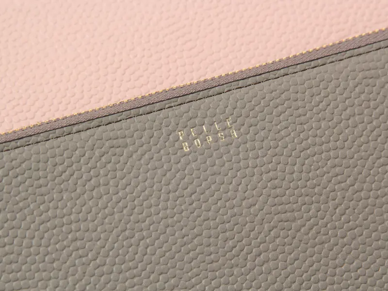 きめ細かなキャビアシボの型押しを施した牛革が、上品で洗練された印象を演出。PELLE BORSA(ペレボルサ)のオリジナルレザーならではの、穏やかで落ち着いた表情も魅力です。フロントには箔押しロゴをさりげなくあしらい、主張しすぎない品のある存在感を添えています。