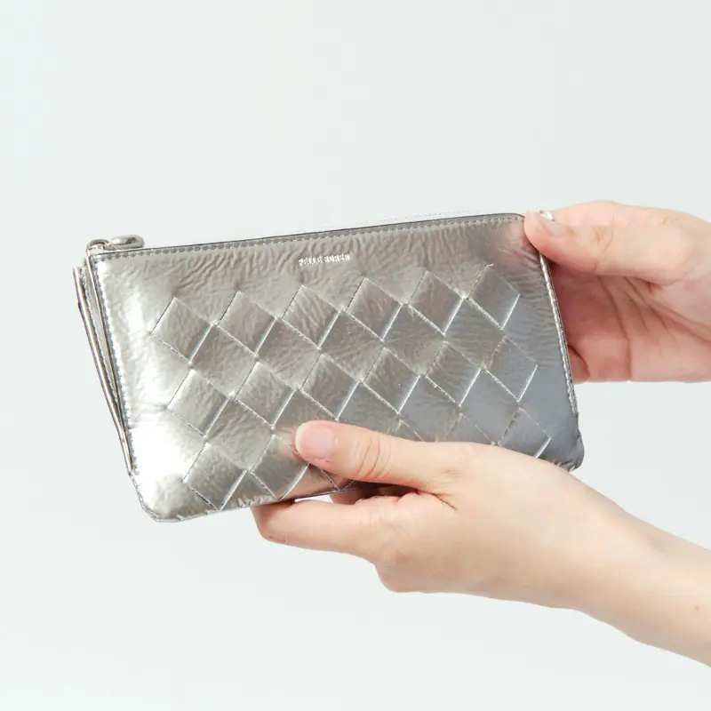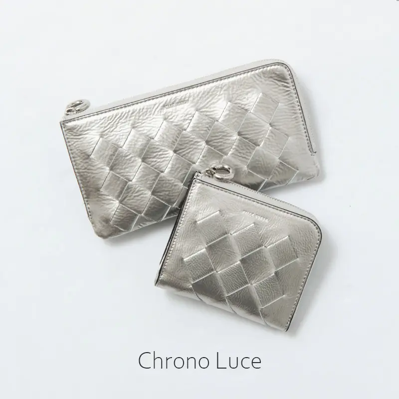 艶やかなエナメル革のイントレチャートが優雅に映える、PELLE BORSA(ペレボルサ)CHRONO LUCE(クロノルーチェ)シリーズ。「お札を折りたくない」長財布派に応える、薄く軽やかなL字ファスナーコンパクト長財布です。L字ファスナーを開くと笹マチ仕様で大きく開き、お札や縦向きカードポケットへスムーズにアクセス可能。背面には片マチ付きの小銭入れとオープンポケットを配置し、必要なものをすっきり収納できます。従来モデルよりひと回り小さく仕上げた、機能美が際立つ一品です。