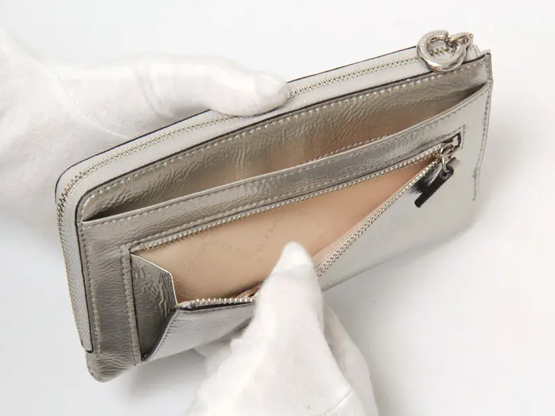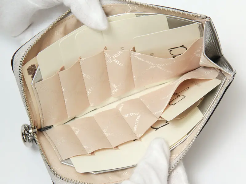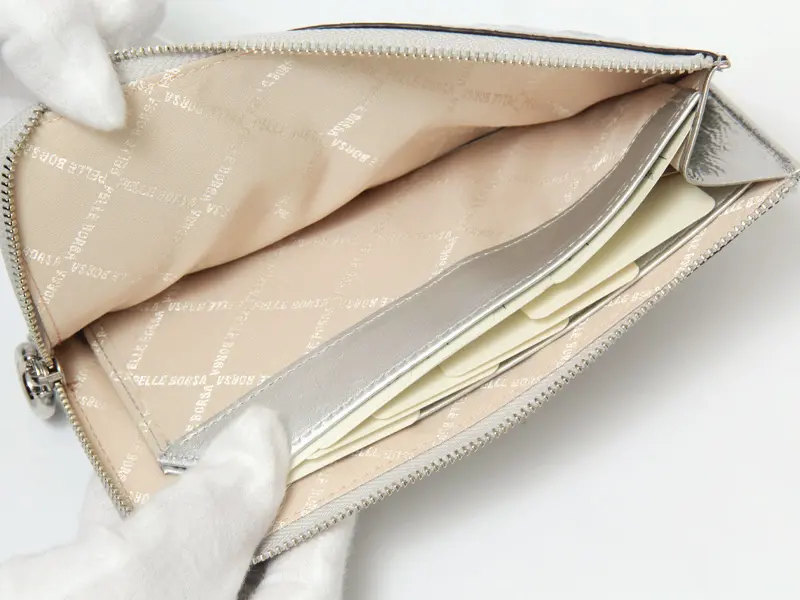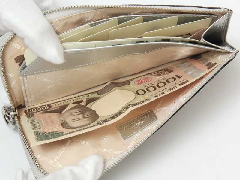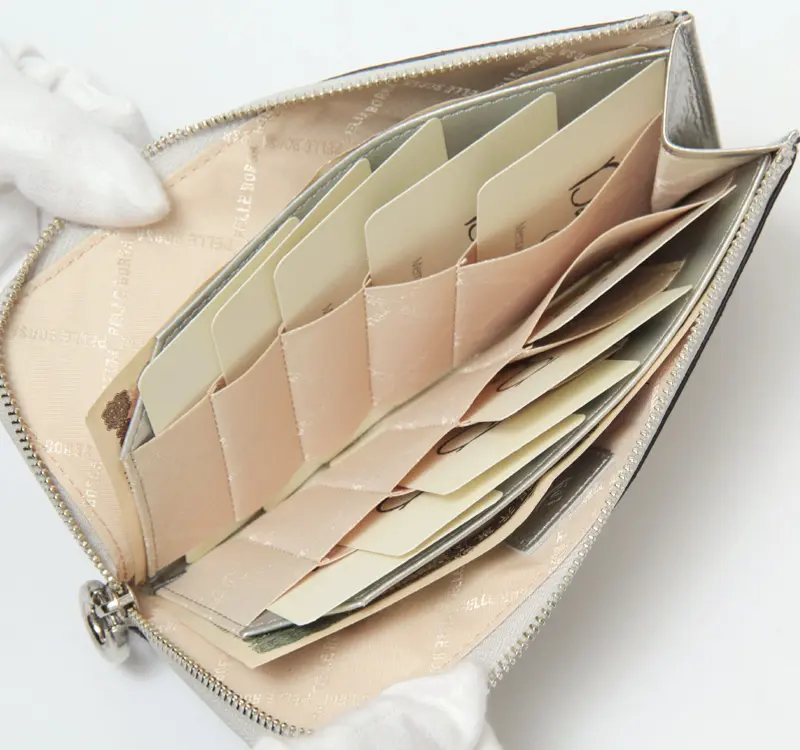 L字ファスナーを開くと大きく開口し、中身をひと目で見渡せる設計。ワンアクションでカードもお札もスムーズに取り出せます。