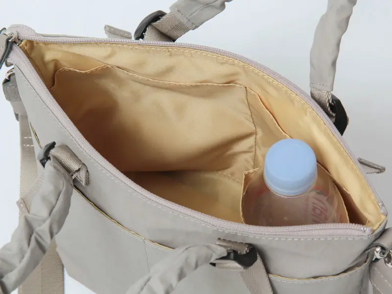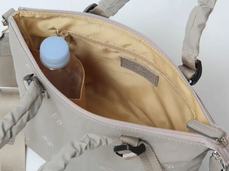開閉はファスナー仕様で、中身が見えにくく安心。内側にはオープンポケットやファスナーポケット、ボトルホルダーを備え、自然と整理整頓が叶う設計です。500mlペットボトルが縦に収まるサイズ感で、日常使いにちょうどよい大きさに仕上げています。