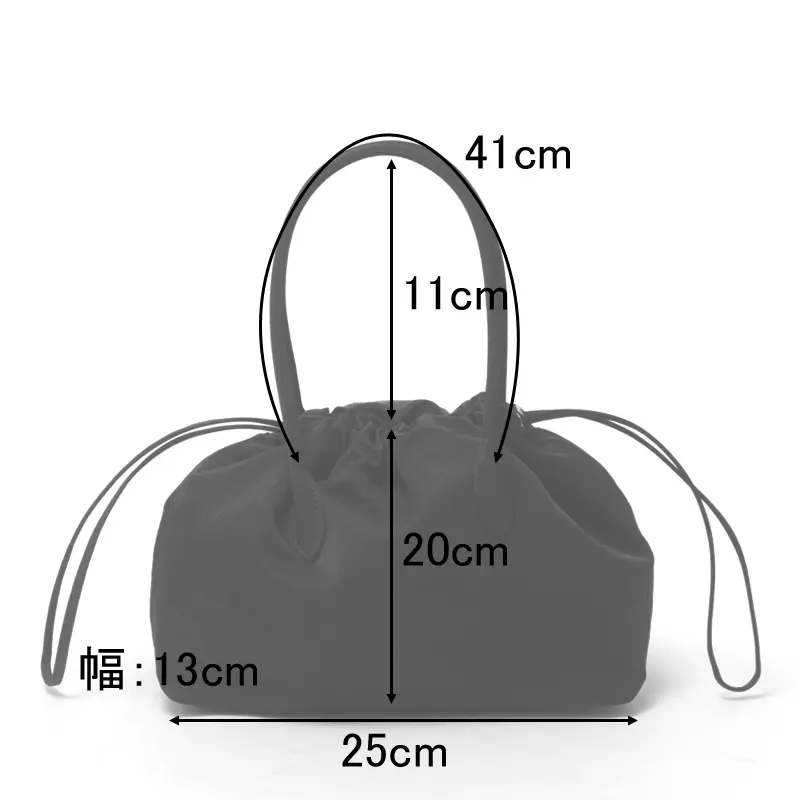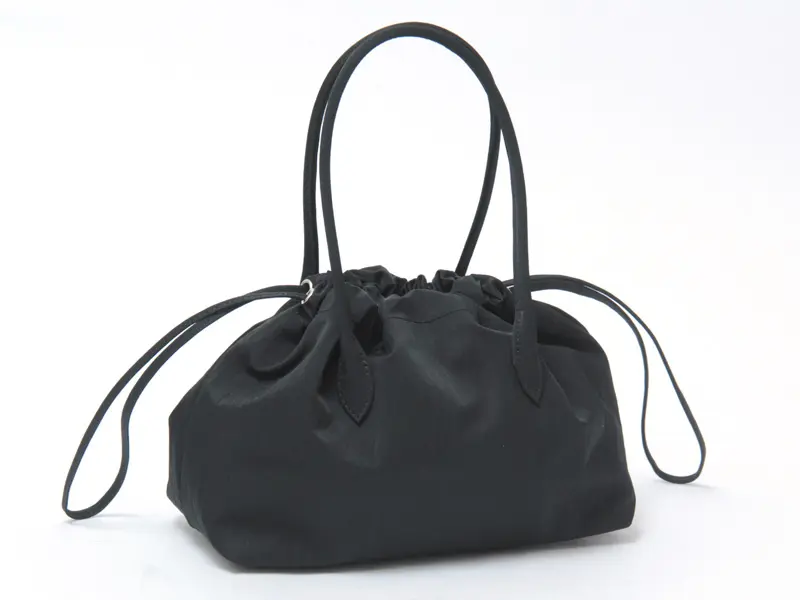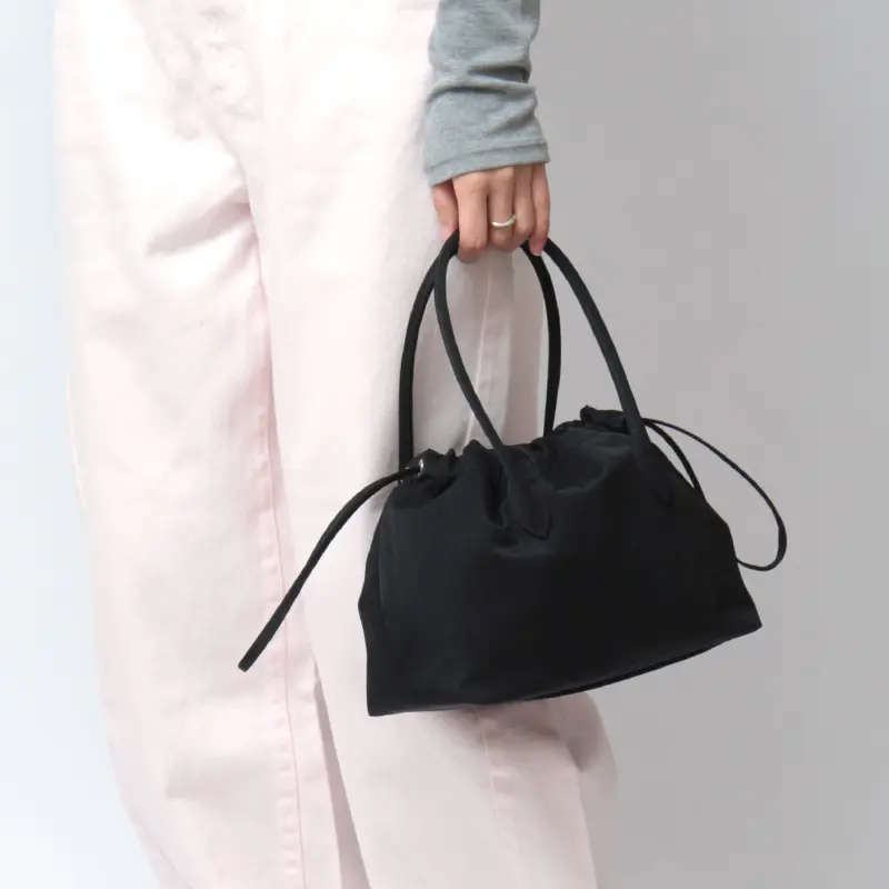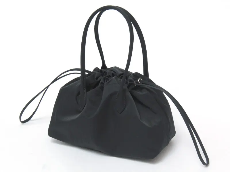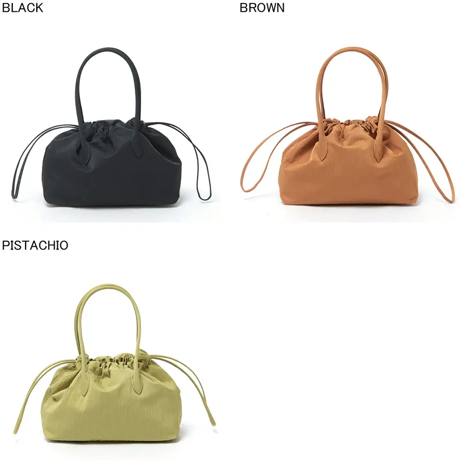 手提げや腕にかけて持つことで、立体的なドレープがより際立つデザイン。きゅっと巾着を絞れば、ギャザーが生まれ、造形的でモードな印象に。ゆるめれば、やわらかなシルエットが現れ、少しリラックスした雰囲気を楽しめるトートバッグです。軽量素材のため、長時間持っても負担になりにくいのも魅力。アクセサリーのようにスタイリングに添えたい、日本製ならではの繊細なフォルムが光る一品です。