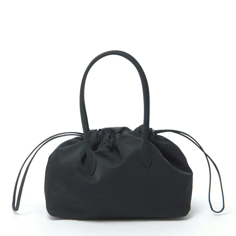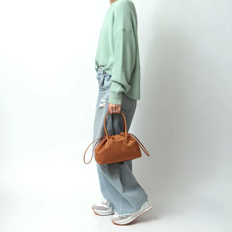 ミニサイズながら、マチ幅があり、長財布やポーチ、眼鏡ケースまで収まる実用的な設計。必需品をしっかり持ち歩ける、日常使いにちょうど良いサイズ感です。開閉は巾着仕様で、荷物の出し入れもスムーズ。内側にはポケットを1つ備え、小物の整理もしやすいデザインに仕上げています。超軽量素材のため、荷物を入れても重さを感じにくいのも魅力。デザイン性と実用性をバランスよく兼ね備えたハンドバッグです。